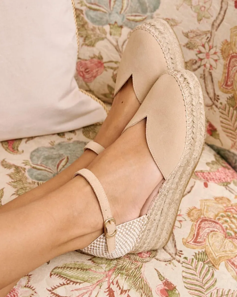 Alpargata con plataforma en serraje en color beige. Puntera ligeramente en punta. Sujeción al talón mediante correa y hebilla. Escote corazón abierto. Fabricación española de yute natural. La plantilla tiene una almohadilla para mayor comodidad. Una alpargata original y cómoda para el día a día.