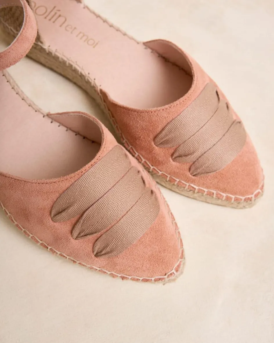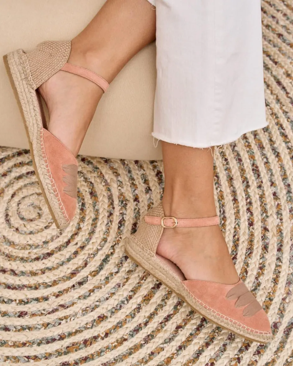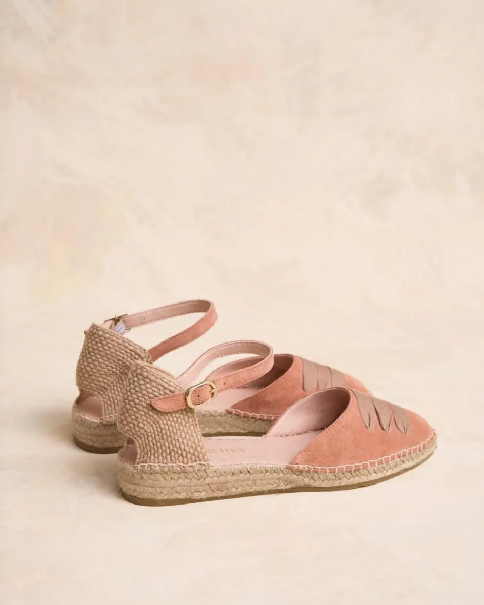 Alpargata plana en serraje en color maquillaje. Puntera ligeramente en punta con detalle de cintas cruzadas. Sujeción al tobillo mediante cinta. Escote redondeado. Fabricación española de yute natural. La plantilla tiene una almohadilla para mayor comodidad. Una alpargata original y cómoda para el día a día.