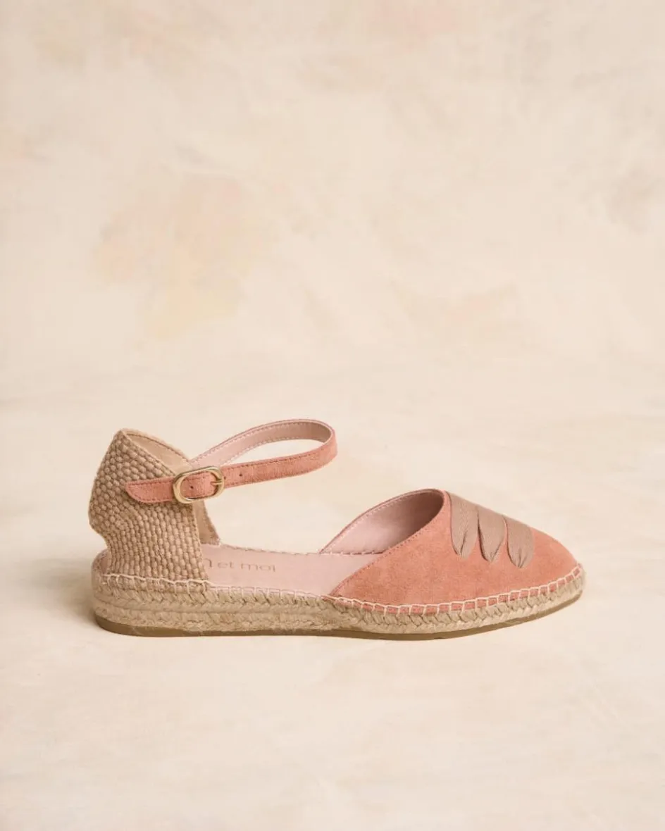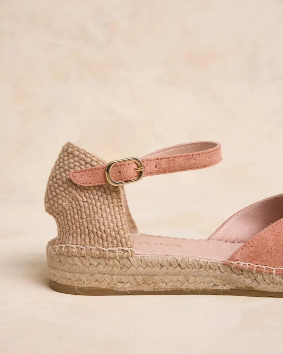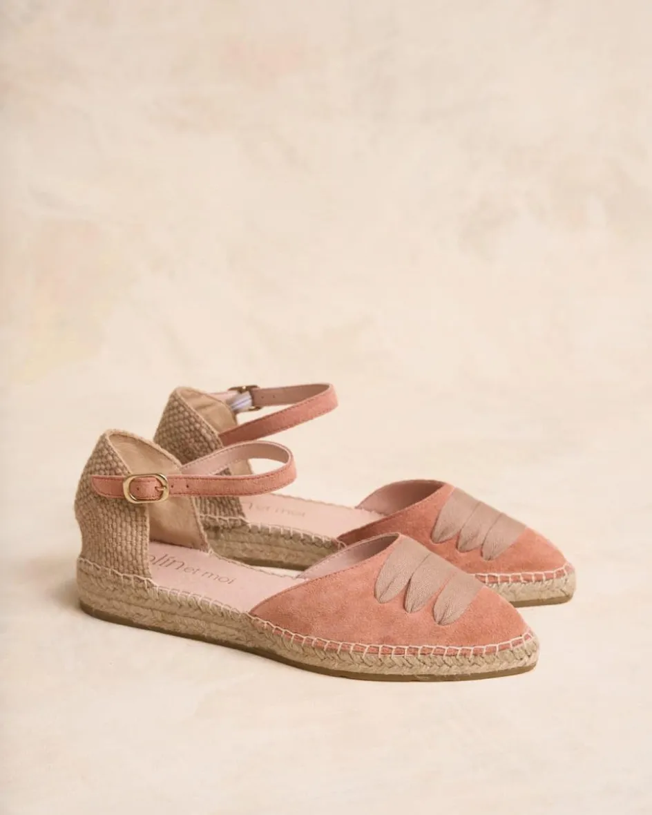 Alpargata plana en serraje en color maquillaje. Puntera ligeramente en punta con detalle de cintas cruzadas. Sujeción al tobillo mediante cinta. Escote redondeado. Fabricación española de yute natural. La plantilla tiene una almohadilla para mayor comodidad. Una alpargata original y cómoda para el día a día.