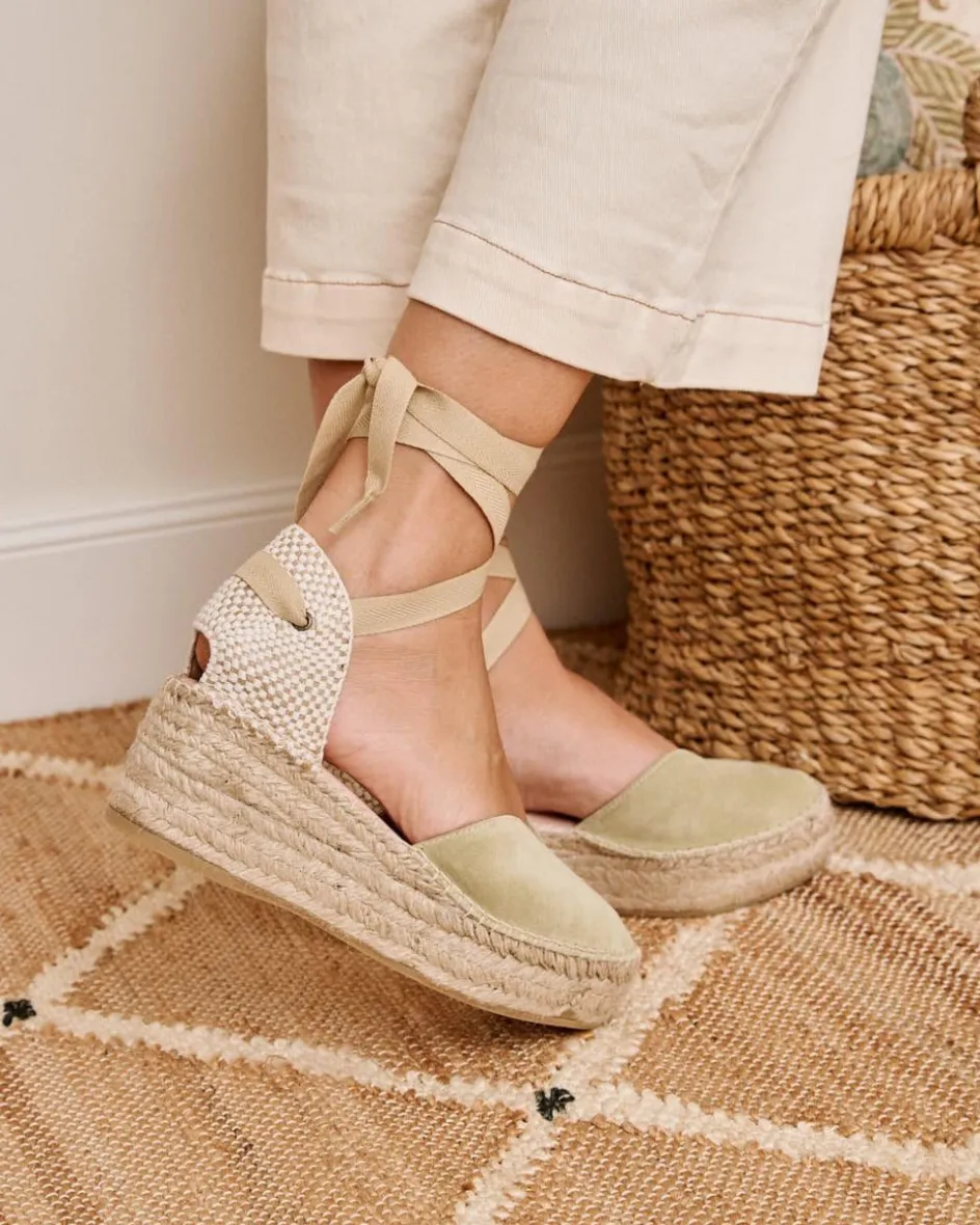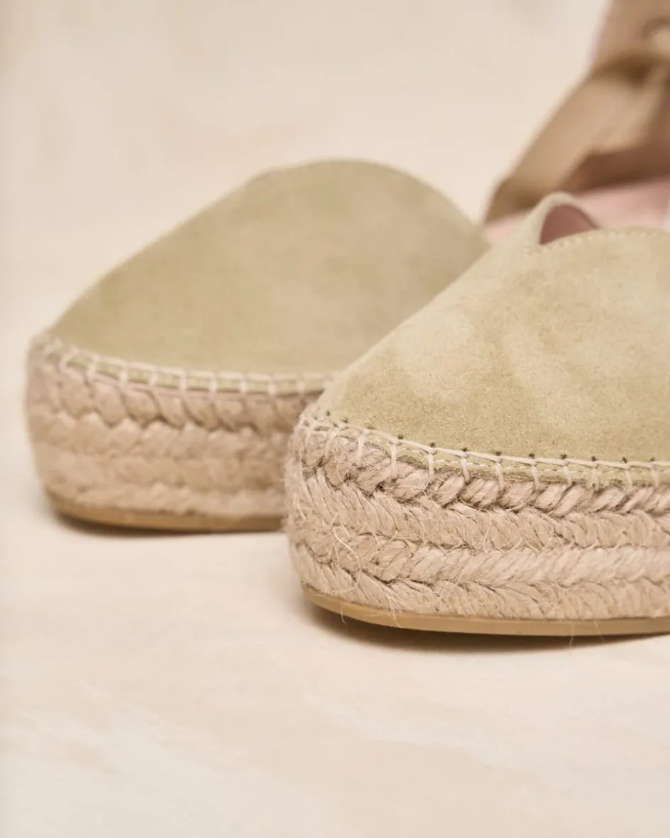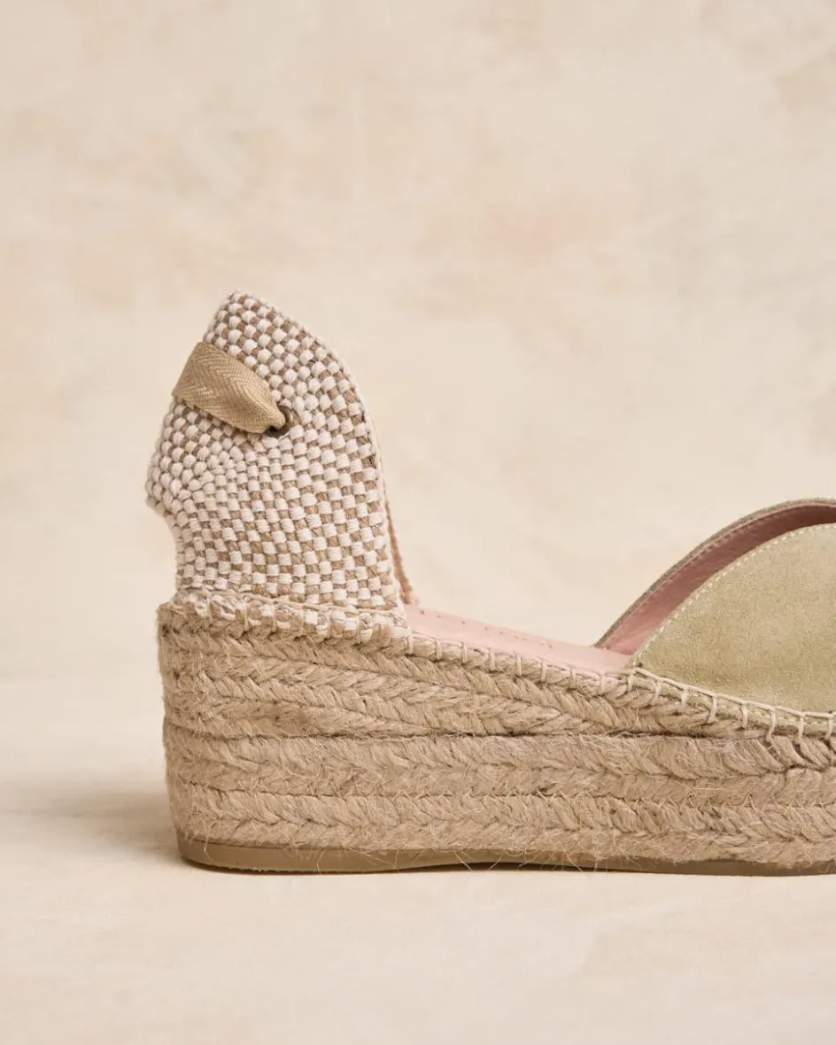 Alpargata con plataforma en color verde pistacho. Punta ligeramente puntiaguda. Sujeción mediante cintas al tobillo. Escote corazón. Fabricación española de yute natural. La plantilla tiene una almohadilla para mayor comodidad. Una alpargata perfecta para todo el día e ideal para combinar con tus jeans favoritos.