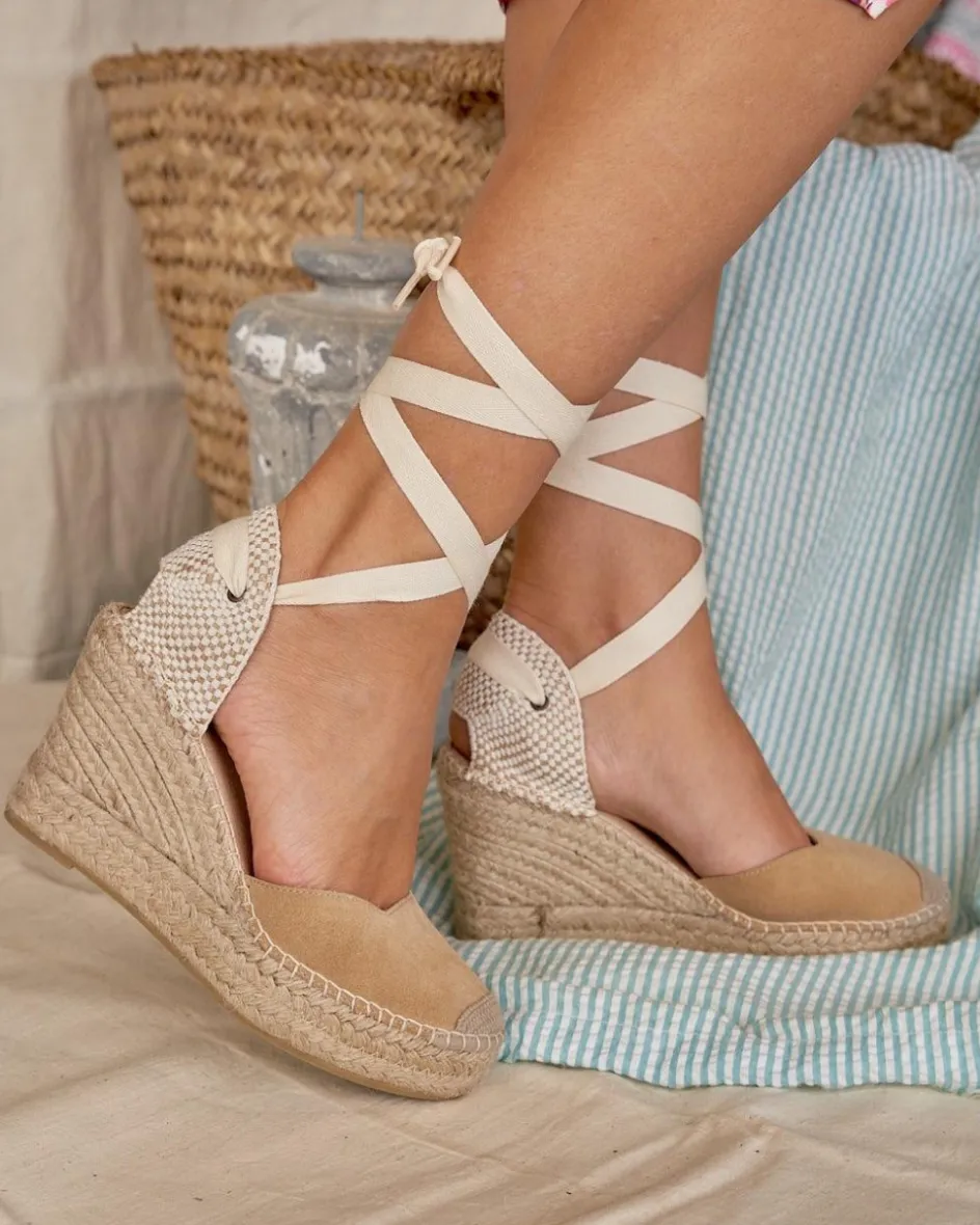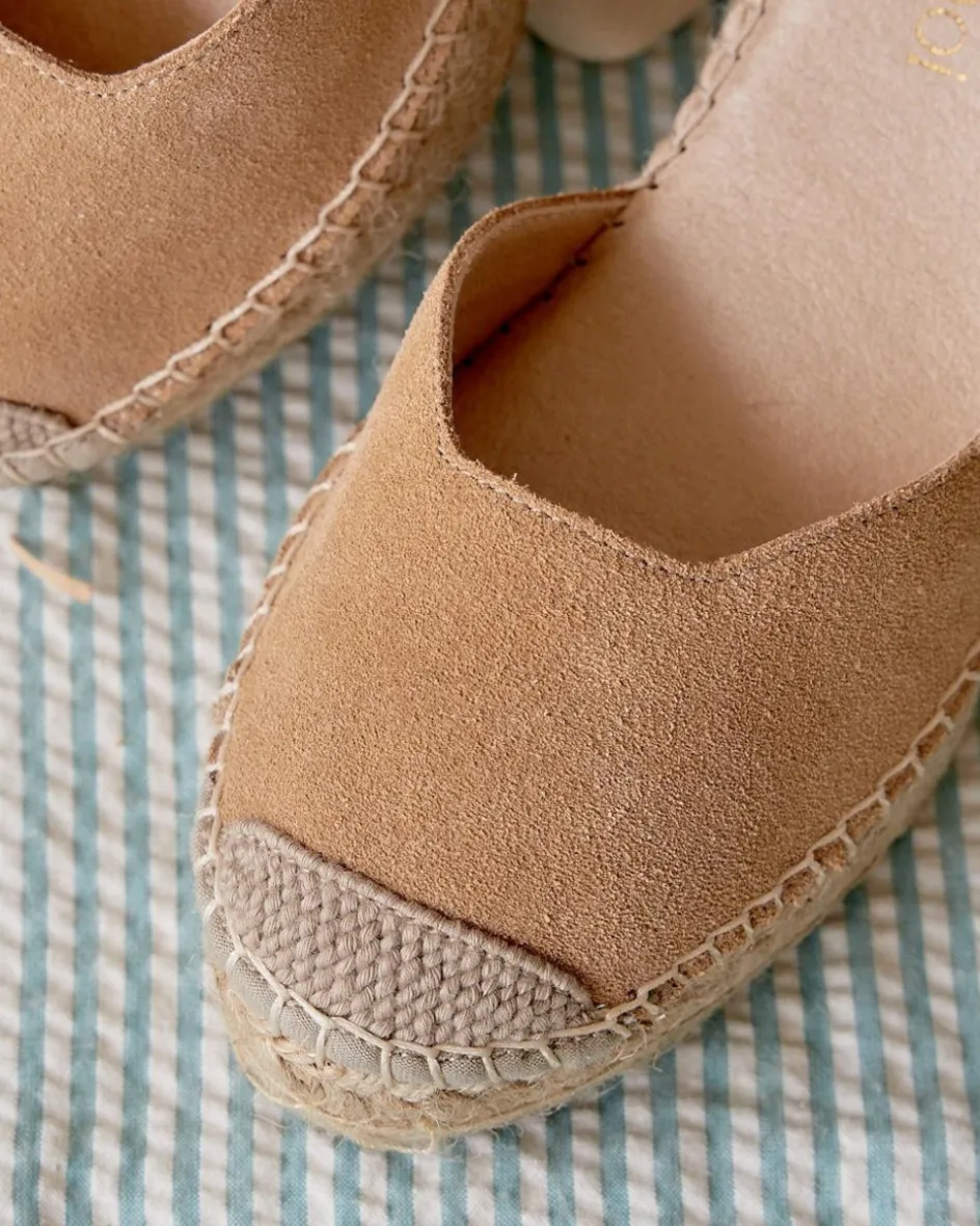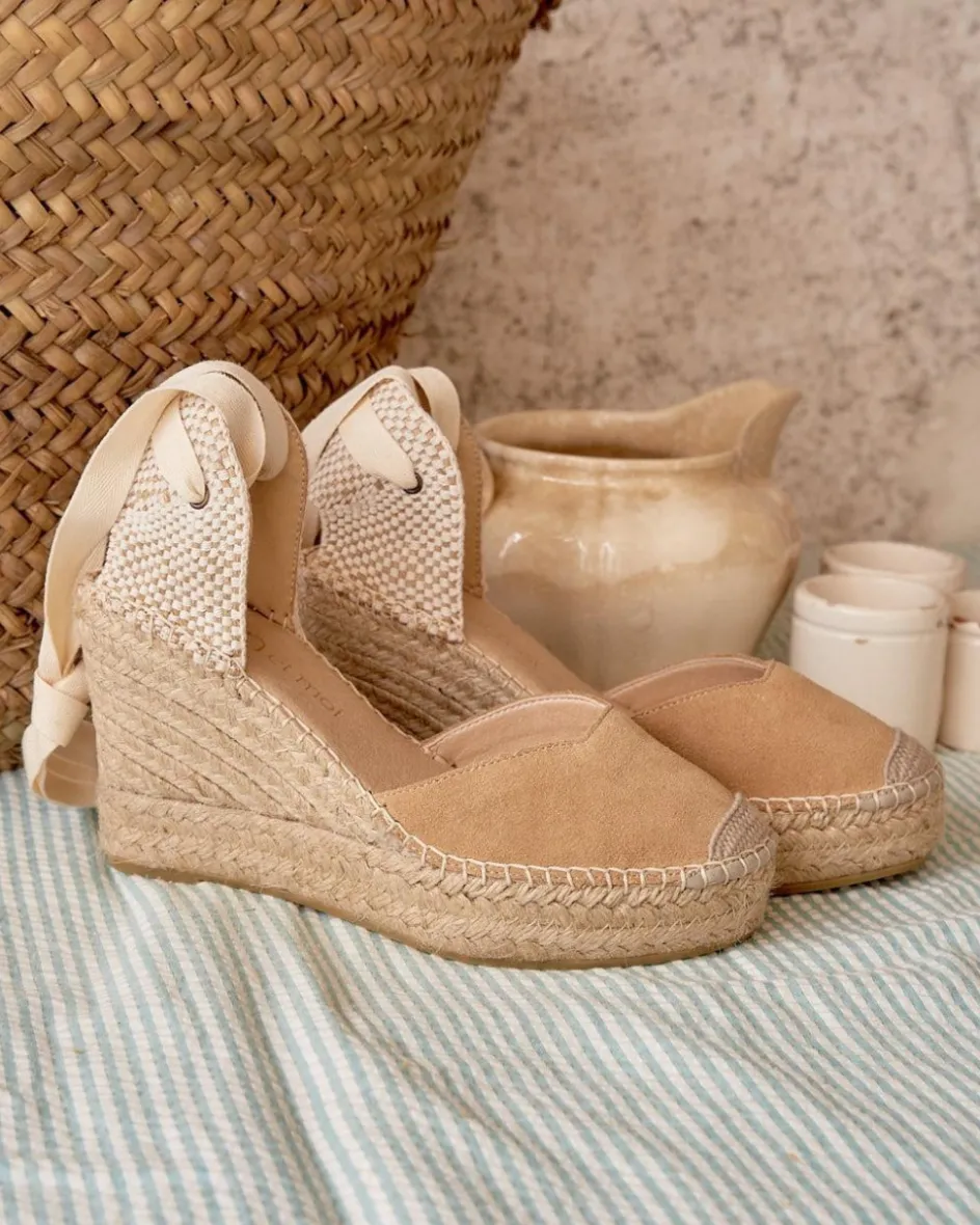Alpargata de cuña en serraje en color camel. Puntera ligeramente en punta. Escote abierto con diseño cuadrado. Cintas en color crudo para anudar cómodamente alrededor del tobillo. Fabricación española de yute natural. La plantilla tiene una almohadilla para mayor comodidad. Una alpargata original que puedes combinar con tus looks favoritos esta temporada. Diseñado y fabricado en España.