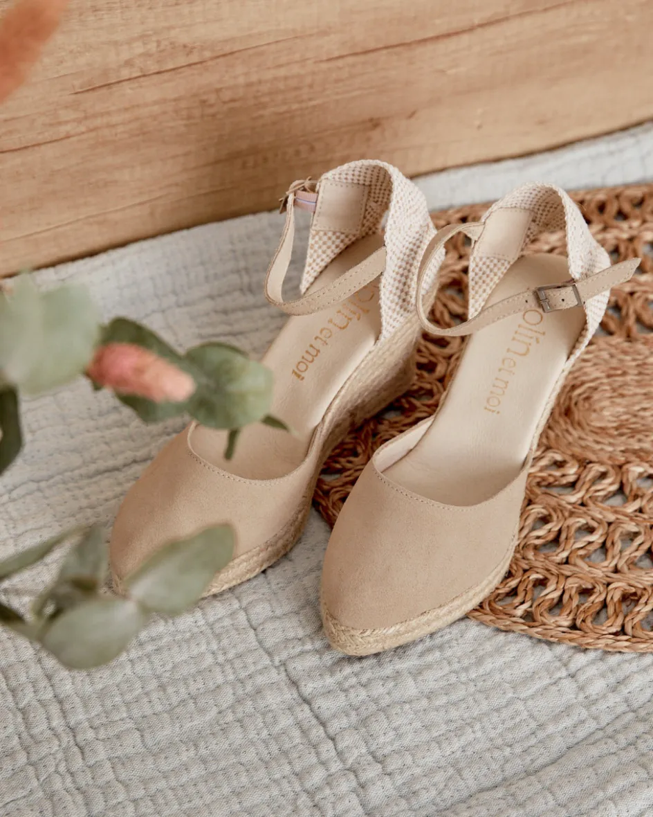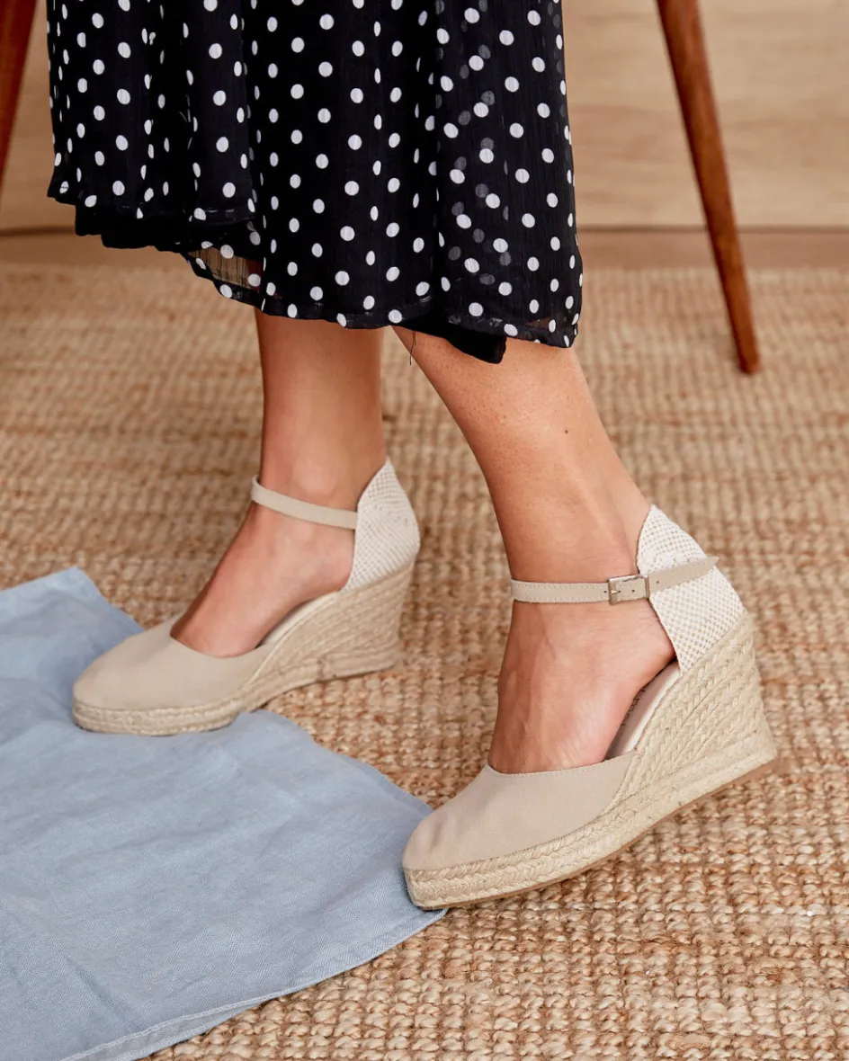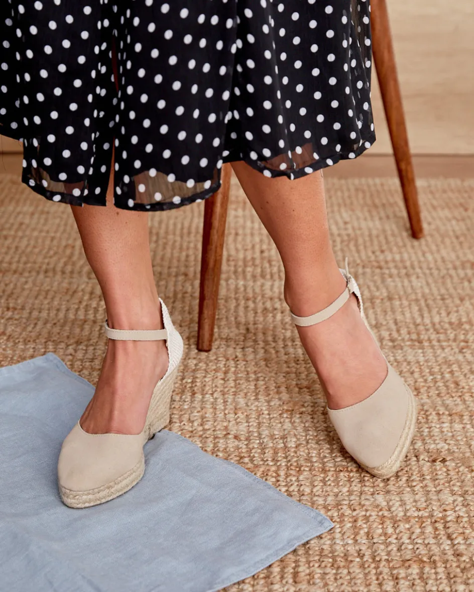 Alpargata de piel de serraje en color piedra. Puntera ligeramente en punta y escote más bajo, a la altura de los dedos. Diseño de cuña con cierre mediante una tira en el mismo tejido y hebilla lateral. Talonera cosida con hilo y esparto. Fabricación artesana de yute natural. Plantilla de la alpargata con almohadilla para mayor comodidad. Un diseño tradicional y versátil para completar tu look. Diseñado y fabricado en España.