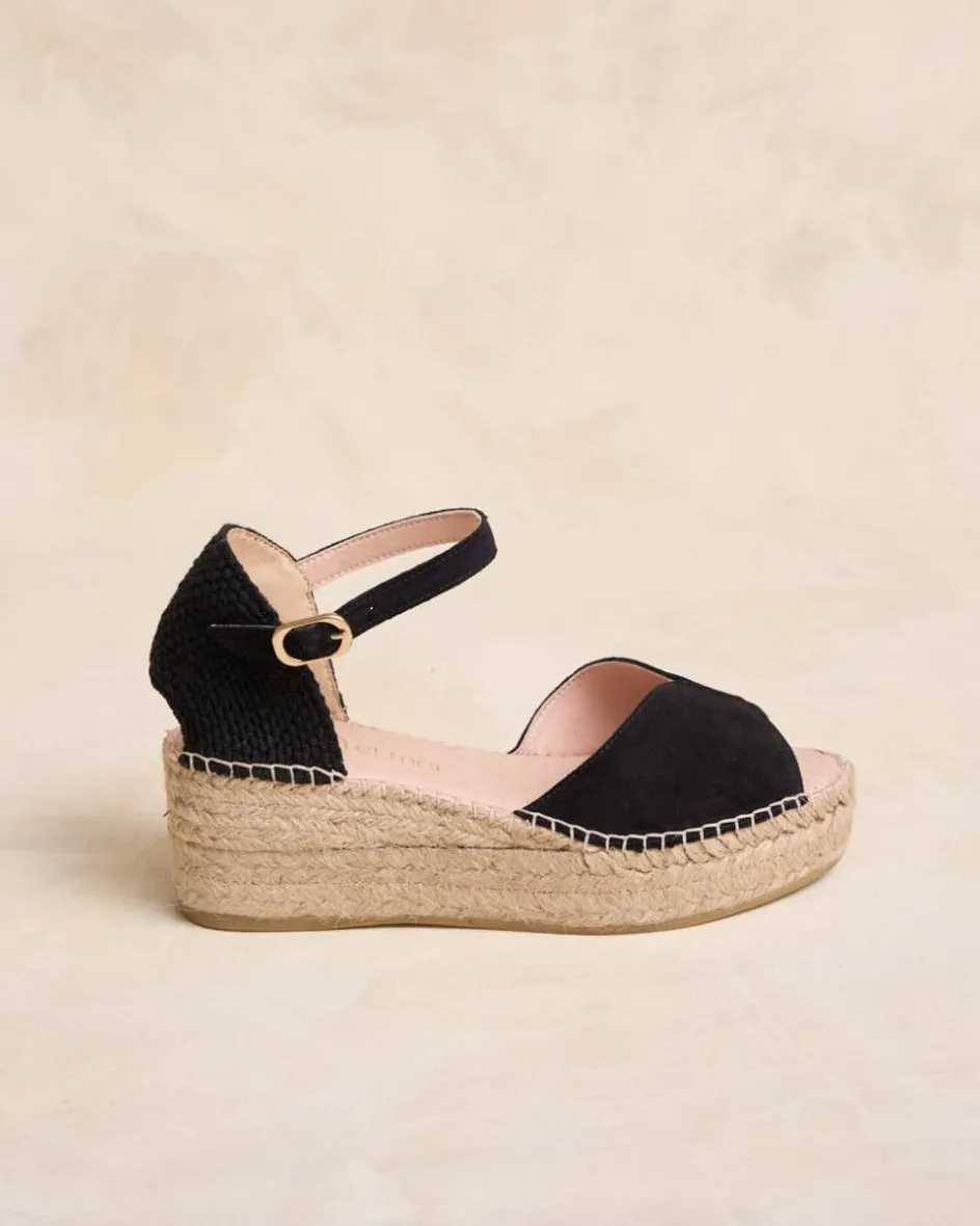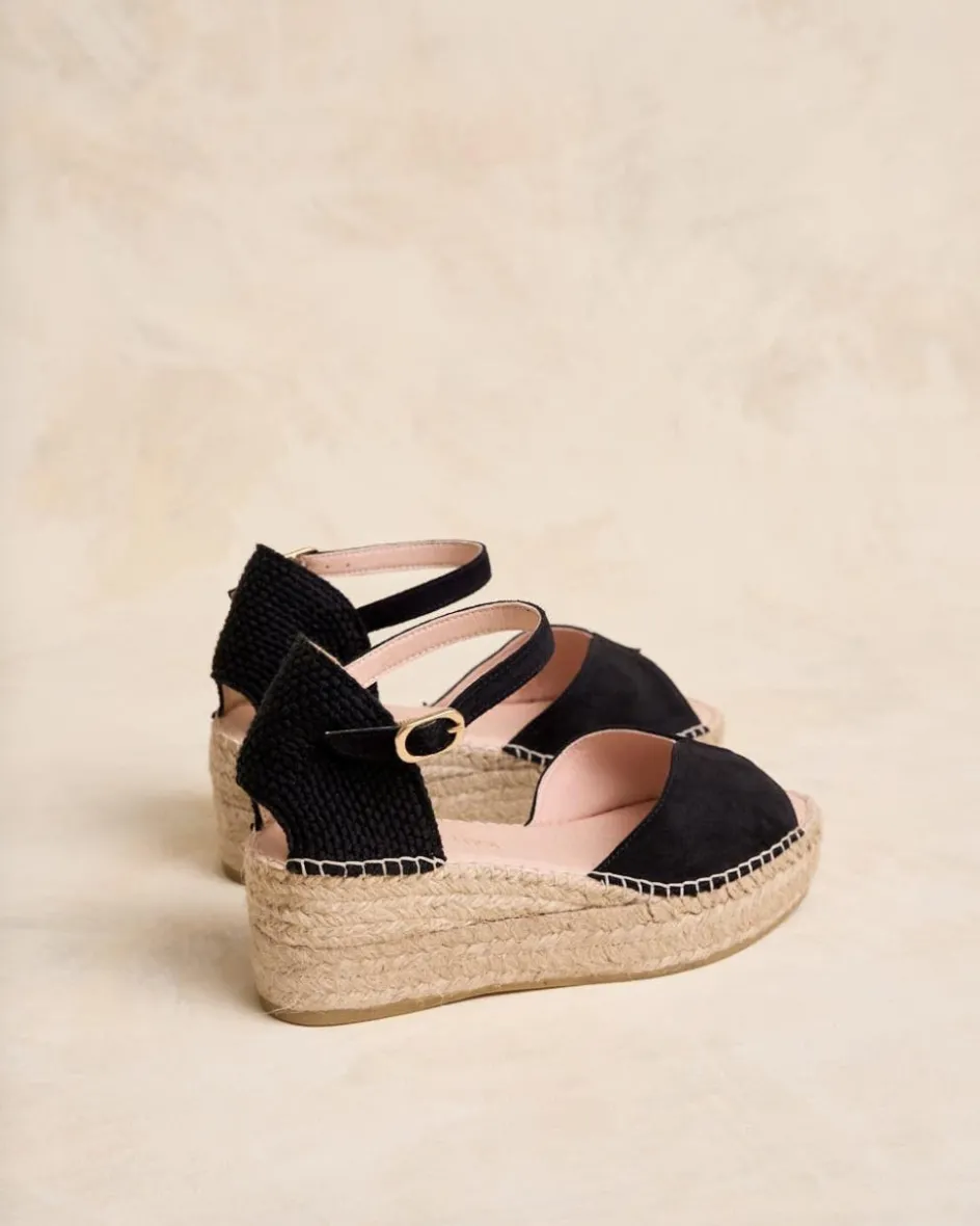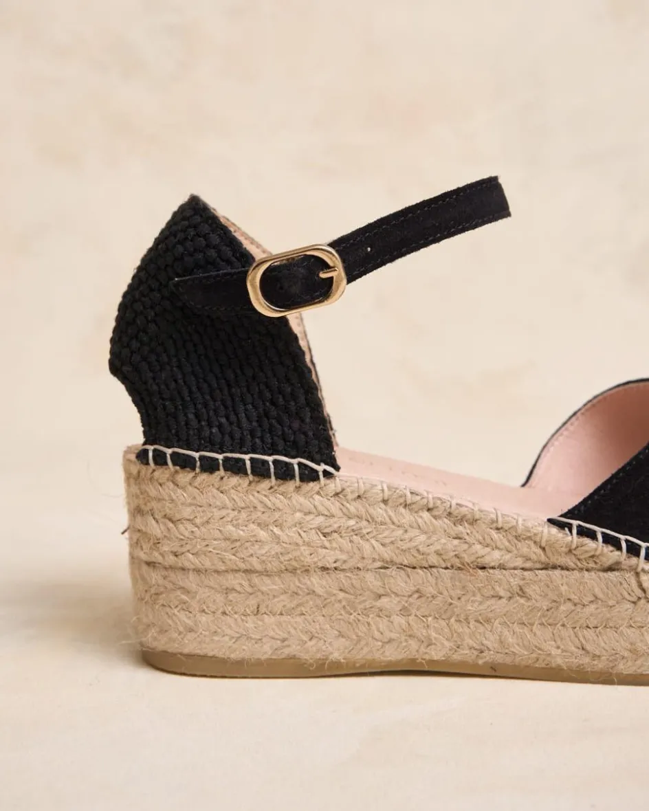 Alpargata con plataforma de ante en color negro. Puntera redondeada y abierta. Escote mariposa. Cierre en el talón con una tira con hebilla ajustable. Cuña de esparto. Un zapato muy femenino y cómodo para crear looks.