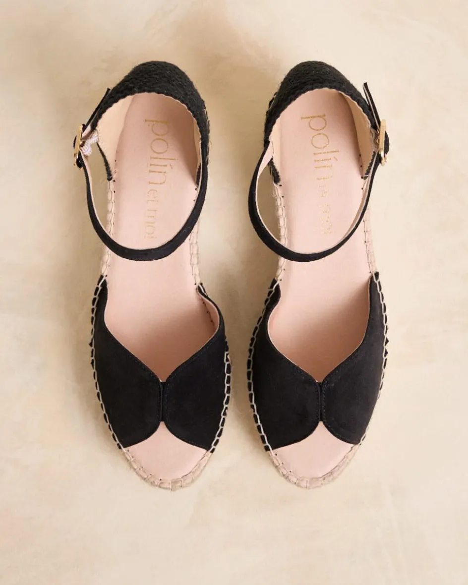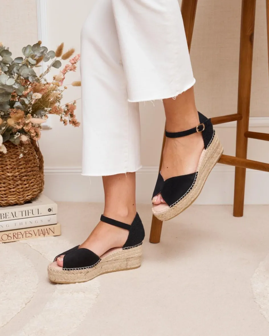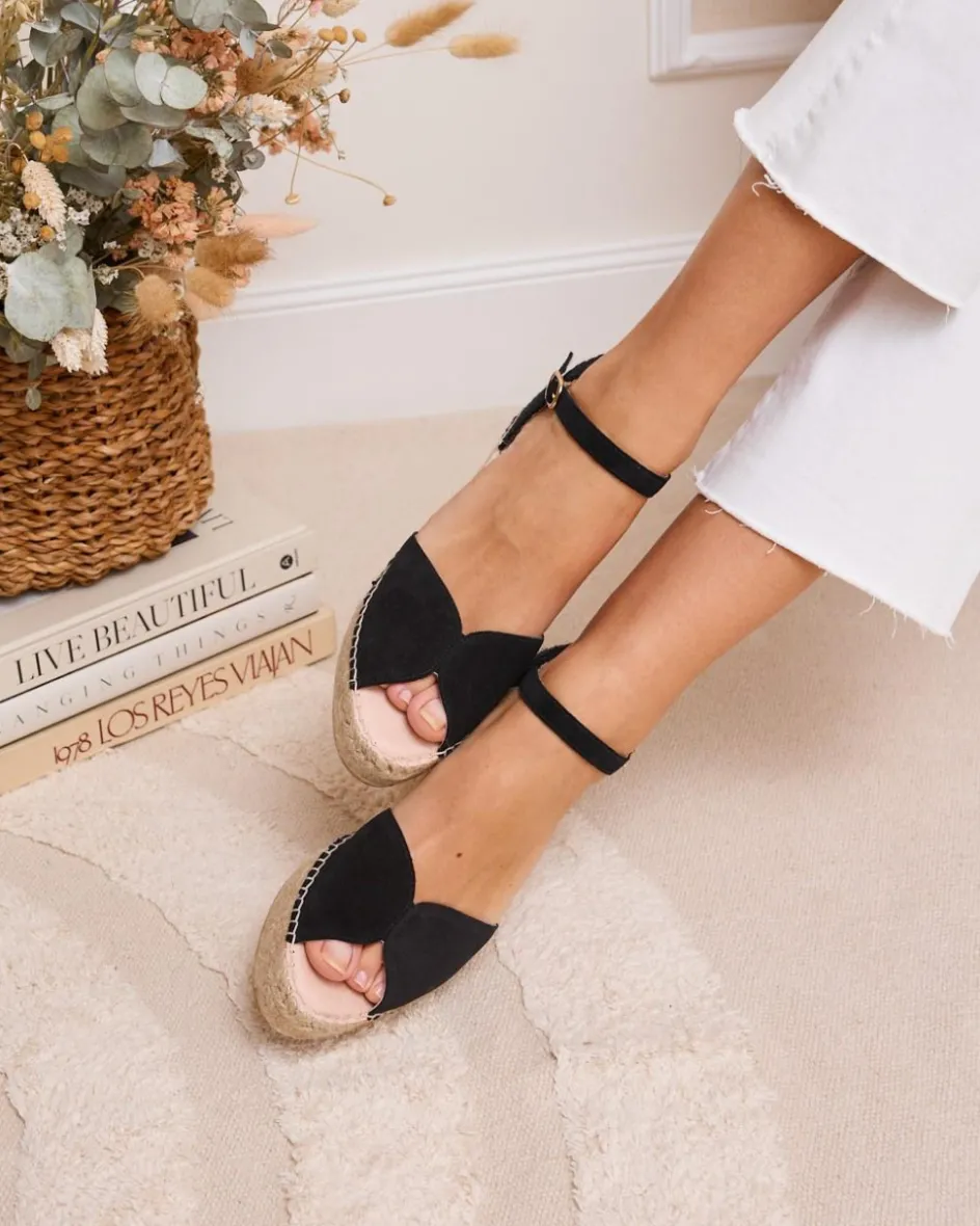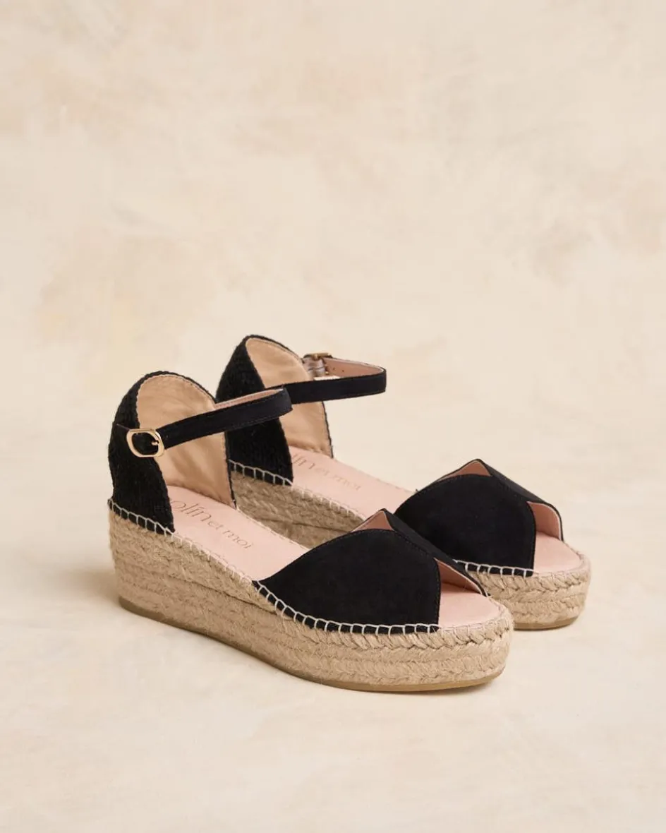 Alpargata con plataforma de ante en color negro. Puntera redondeada y abierta. Escote mariposa. Cierre en el talón con una tira con hebilla ajustable. Cuña de esparto. Un zapato muy femenino y cómodo para crear looks.