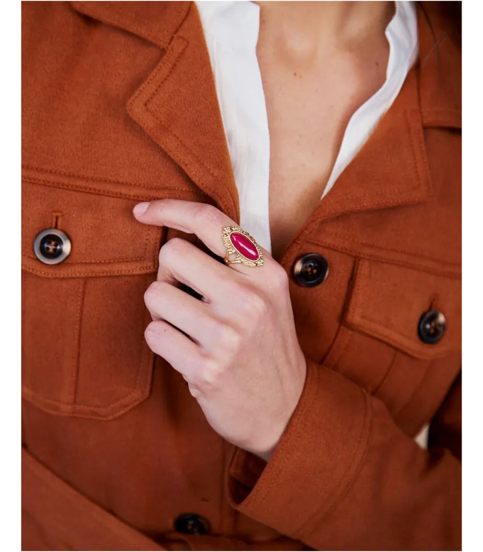 Anillo en dorado ajustable con piedra en color cereza ovalada.