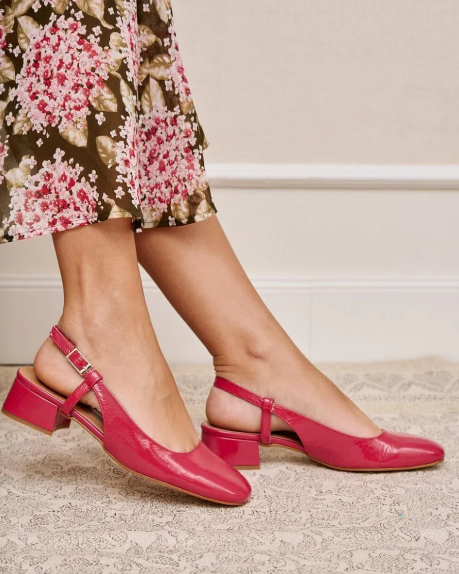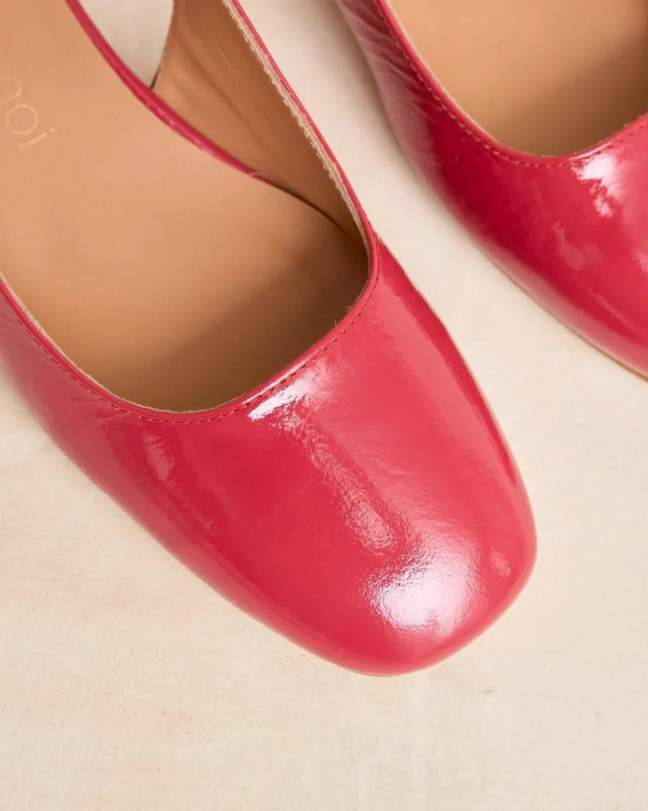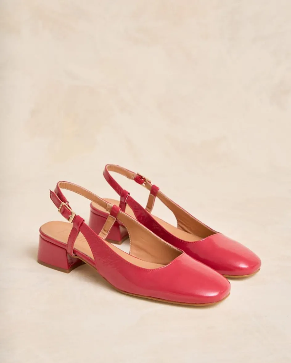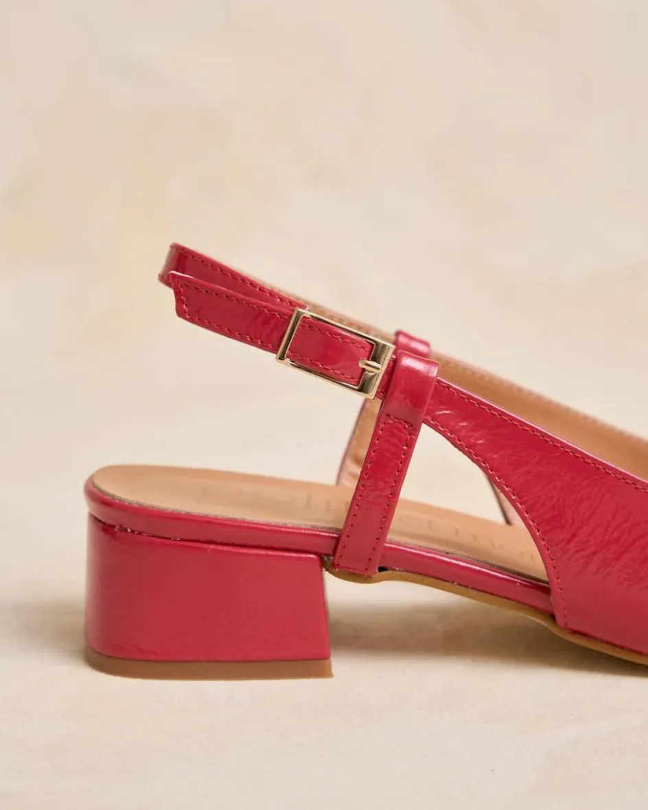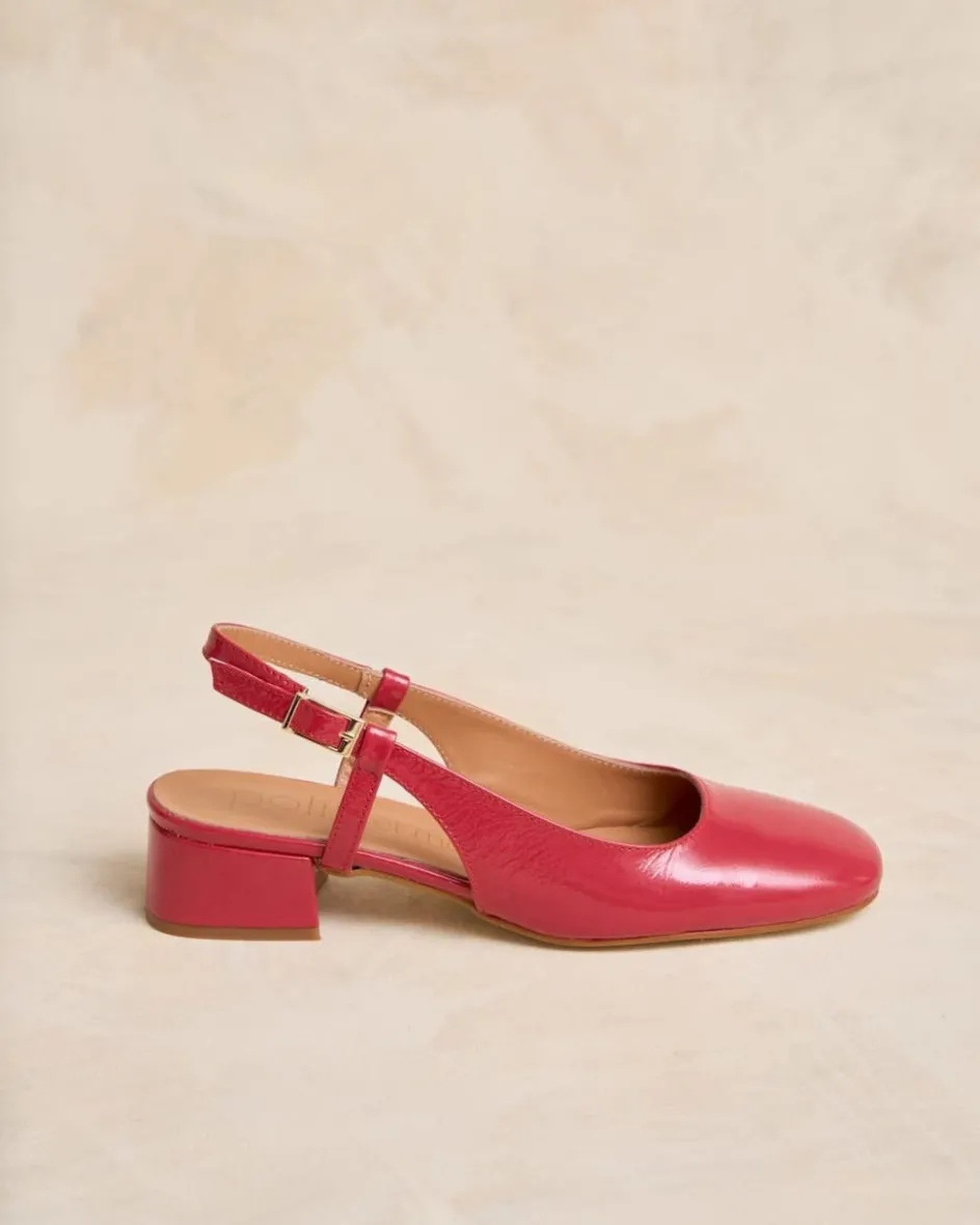 Bailarina de charol destalonada en color cereza. Puntera cuadrada. Correa al talón con hebilla. Pequeño tacón cuadrado. Es un calzado diferente y cómodo para combinarlo tanto con pantalones como con vestidos.