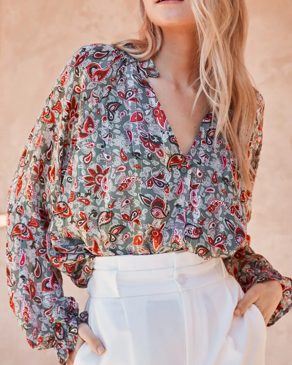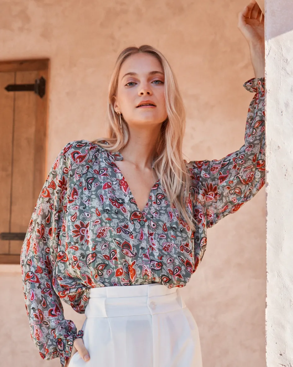 Blusa con estampado de amebas multicolor sobre un fondo color eucalipto. Cuello redondo con un pequeño volante y escote en pico. Modelo de manga larga abullonada y terminada en puño. Modelo de cuerpo recto. Hilera de botones desde el escote hasta el bajo. La camisa de estilo boho perfecta para combinar con tus mejores faldas o jeans en este otoño.