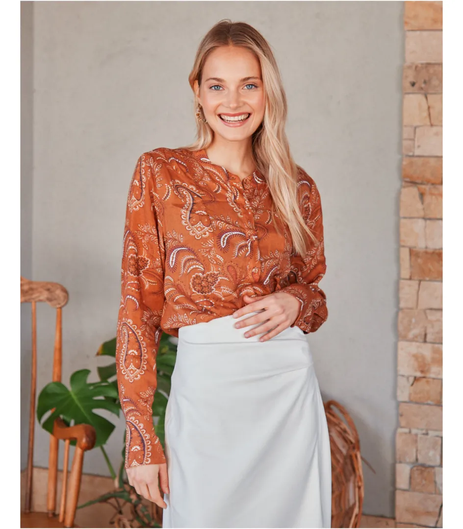 Blusa con estampado en color teja. Cuello redondo y escote en pico. Modelo de manga larga terminada en puño. Cuerpo recto. Hilera de pequeños botones forrados desde el cuello hasta el bajo. Blusa en un tejido fluido y colorido. Ideal para aportar un toque boho y sofisticación a tus looks.Blusa diseñada en España.