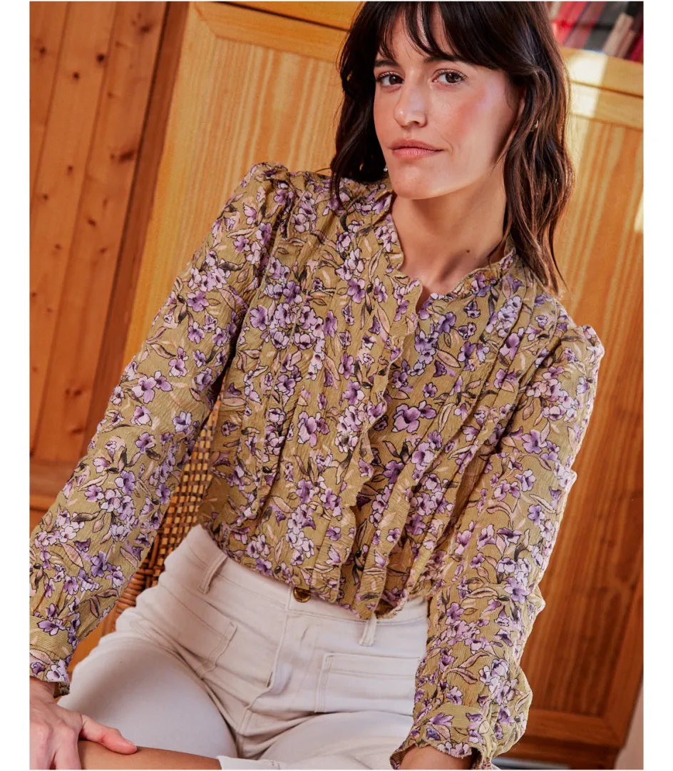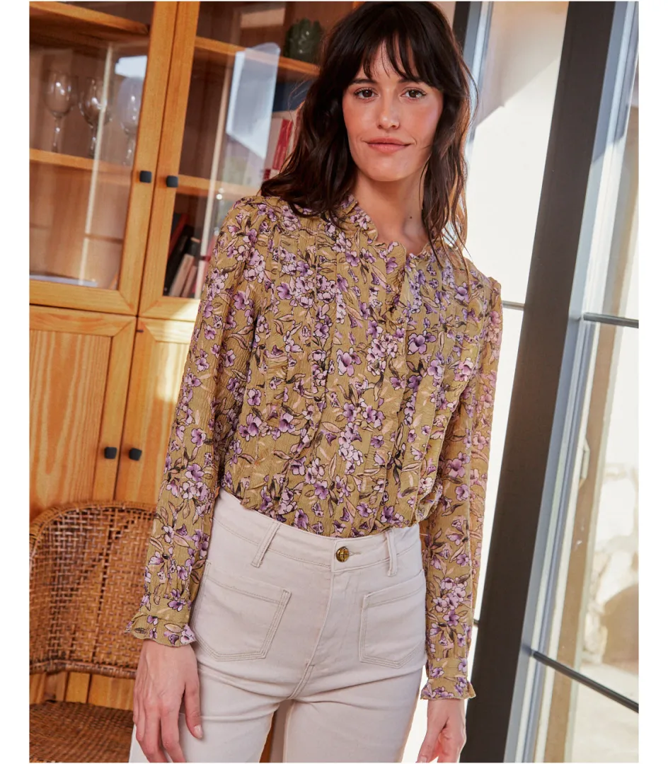 Blusa con estampados florales en color verde oliva. Cuello redondo ligeramente subido mediante volante. Modelo de manga larga terminada en puño y volante. Modelo de cuerpo recto. Hilera de pequeños botones desde el cuello hasta el bajo, pliegues y volantes en la parte delantera. Una blusa alegre, Ideal para lucir el color de esta temporada junto a tus jeans favoritos de este otoño-invierno.
