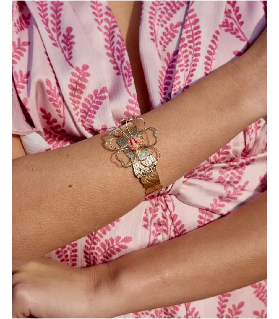 Brazalete rígido con detalle de flor rígida y en el centro pequeños brillantes en tonos rosados, ideal para completar tus looks.
