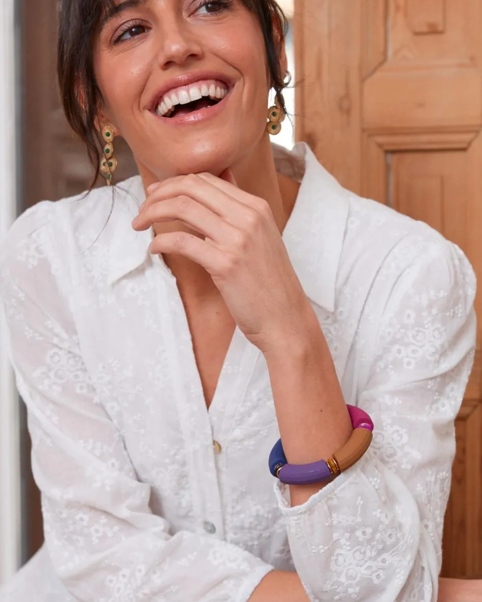 Brazalete elástico con piezas en varios colores como azul, verde, buganvilla… Cuenta con charms alargados y rígidos, separados por piezas más pequeñas en los mismos tonos. Perfecto para completar tus looks.