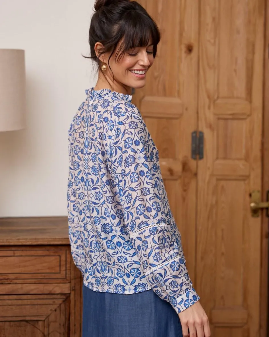 Camisa con estampado floral sobre un fondo azul klein. Cuello mao, un poco estilo volante. Modelo de camisa con manga larga recta, con el final en puño pequeño. Hilera de botones desde el cuello hasta el bajo. Blusa con toque romántico y perfecta para el día a día.