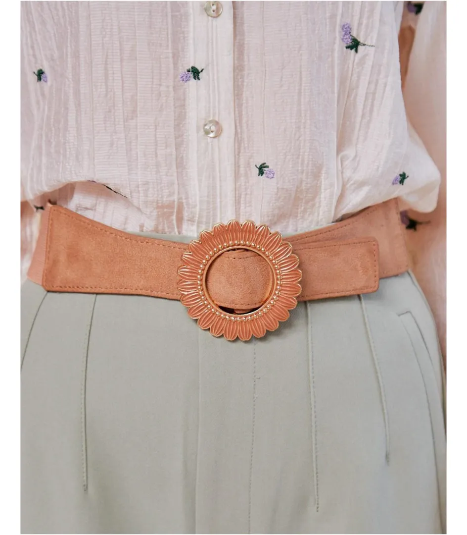 Cinturón elástico de polipiel en color camel. Cierre mediante una hebilla de gran tamaño con forma de flor. Ideal para darle un toque diferente a tus looks esta temporada.