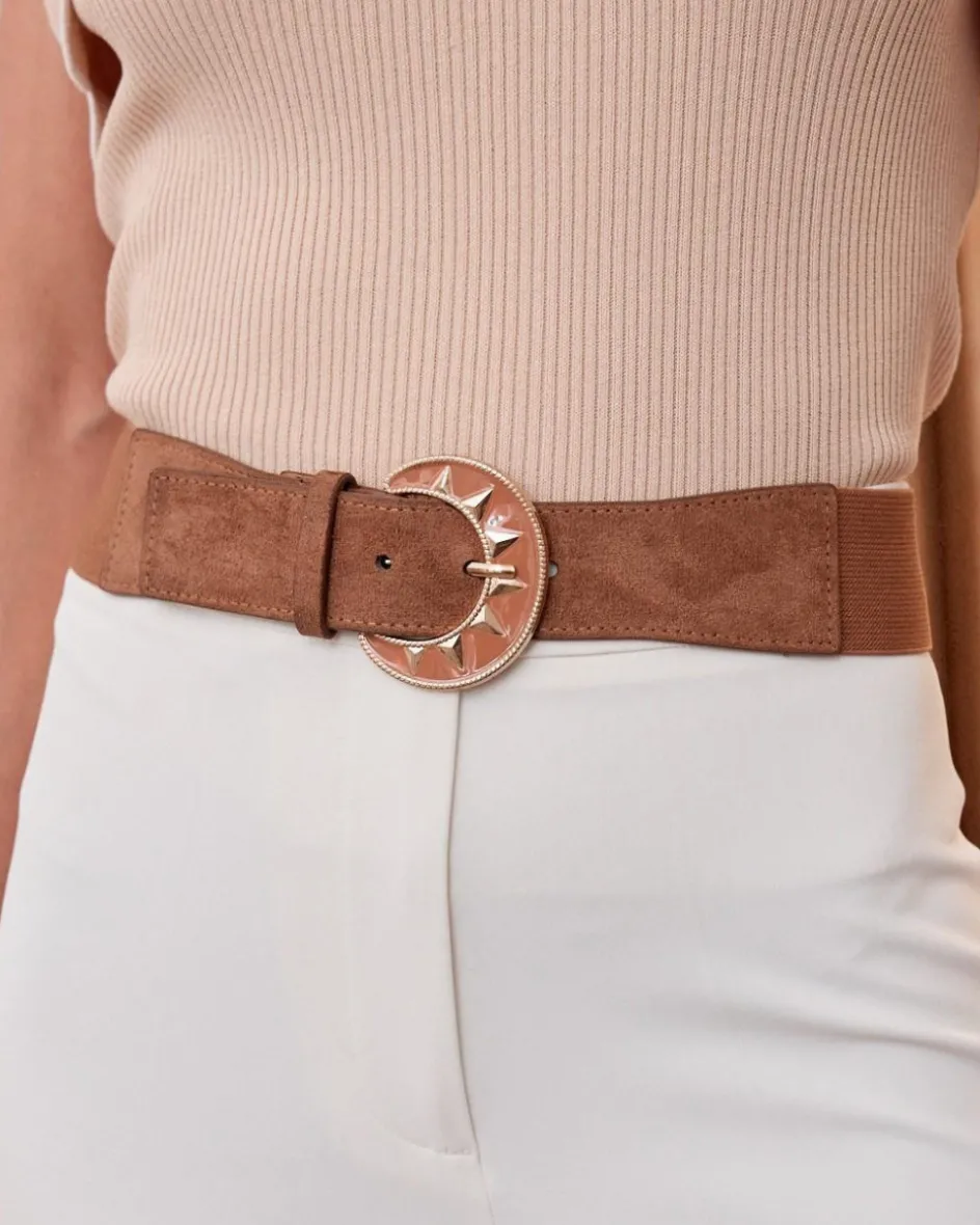 Cinturón elástico y de ante tono camel. Con hebilla camel y detalles en triángulo en dorado. Accesorio ideal para completar tus looks y darles un toque diferente.