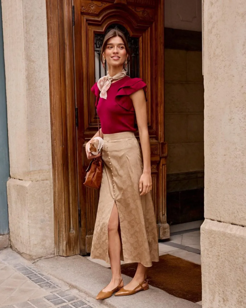 Falda midi taupé con estampado bordado. Falda satinada con abertura central. Hilera de botones de decoración, desde la cintura hasta un poco más abajo de la mitad de la falda. Modelo recto.