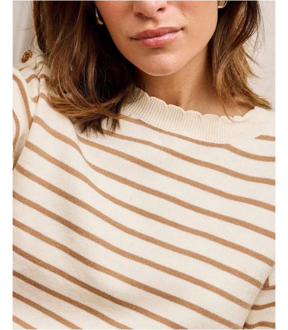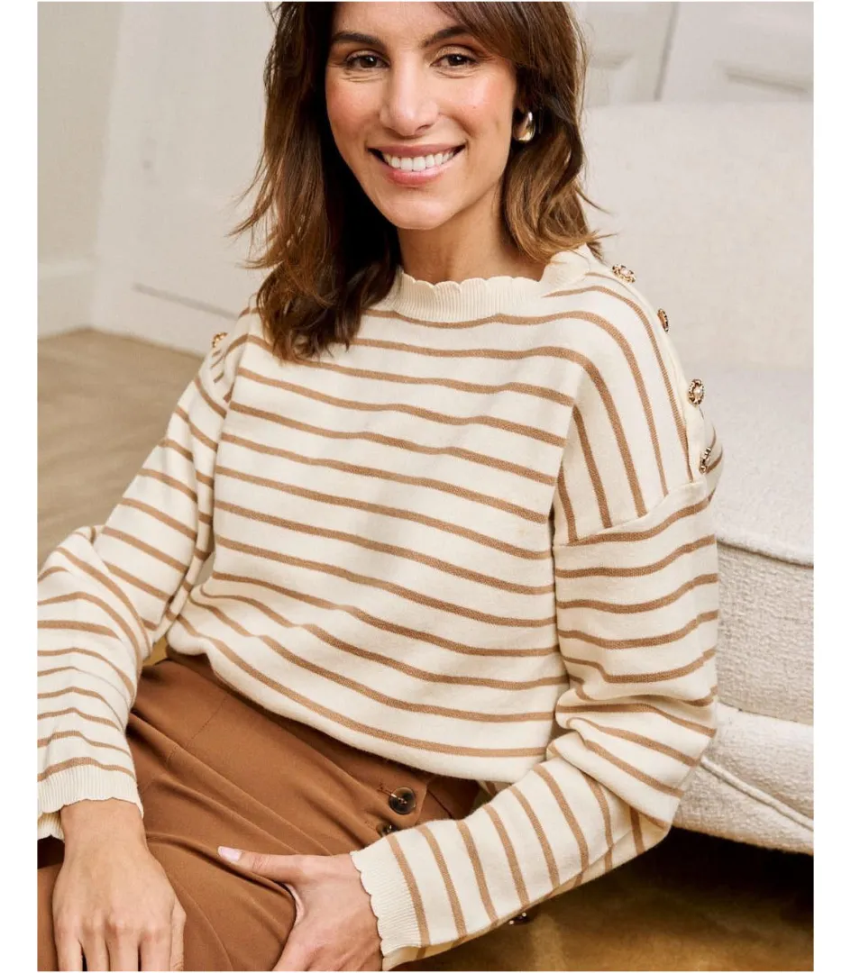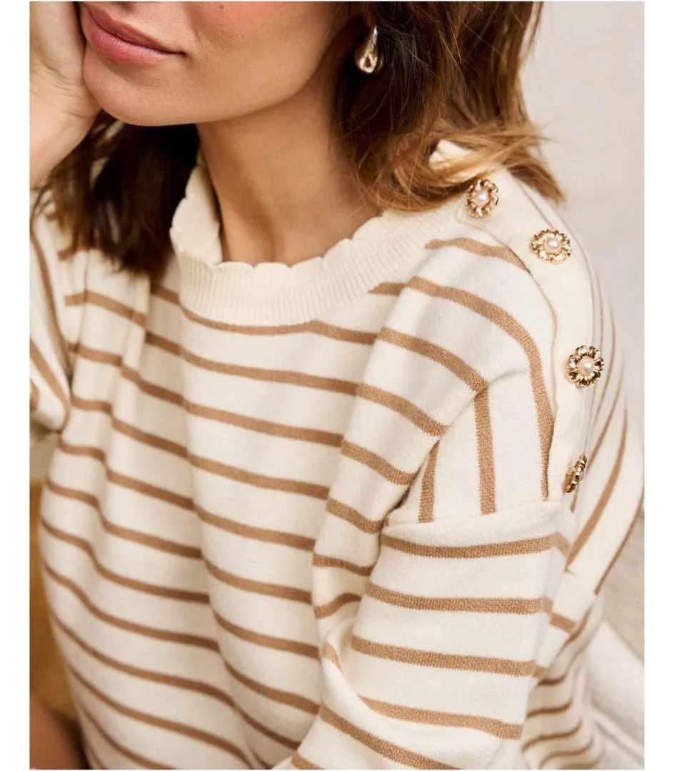 Jersey de punto en color beige con rayas marineras. Cuello redondo con detalles de botones dorados sobre el hombro y manga larga recta. Diseño de cuerpo recto.