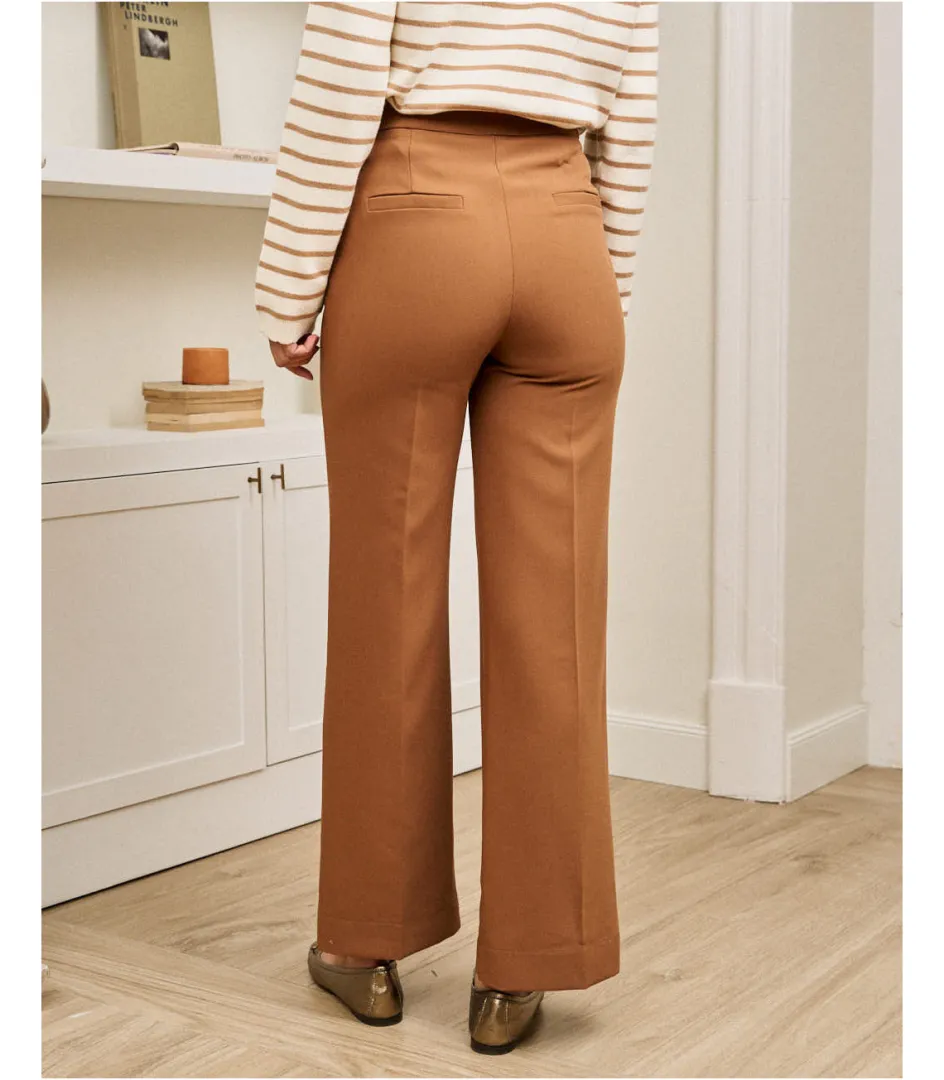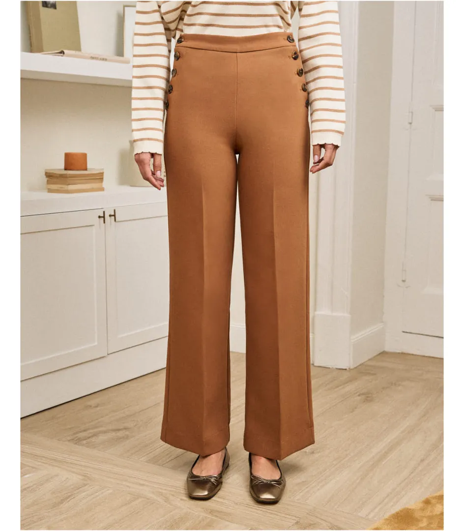 Pantalón de pinzas en color marrón. Pantalón a la cintura con hileras de botones colocados en ambos laterales. Fitting ligeramente ajustado. Un pantalón ideal con detalles muy especiales.