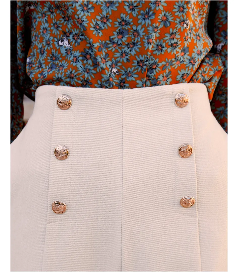 Pantalón de pinzas en color beige. Cintura con goma trasera para mayor comodidad. Detalle de pinzas con triple botonadura dorada a ambos lados. Bolsillos a cada lado del pantalón. Fitting fluido. Un pantalón ideal con detalles muy especiales.