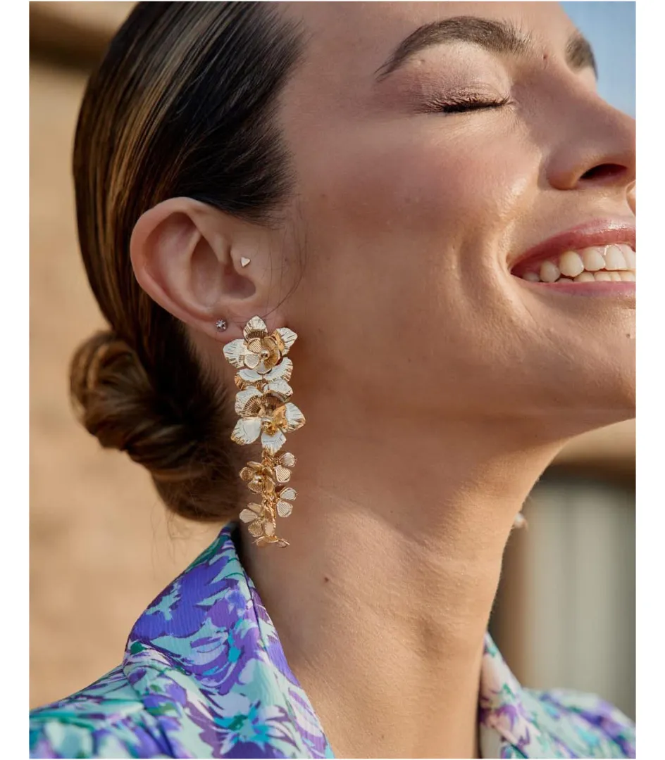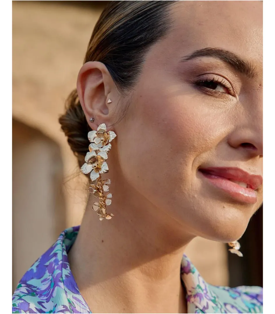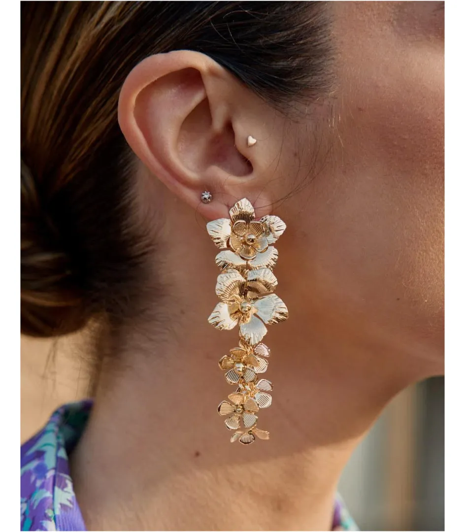 Pendientes largos con múltiples flores en forma de cascada. Pendientes con diseño alargado y muy ligeros. Cierre mediante tuerca. Un pendiente ideal para darle un toque diferente a tu look.