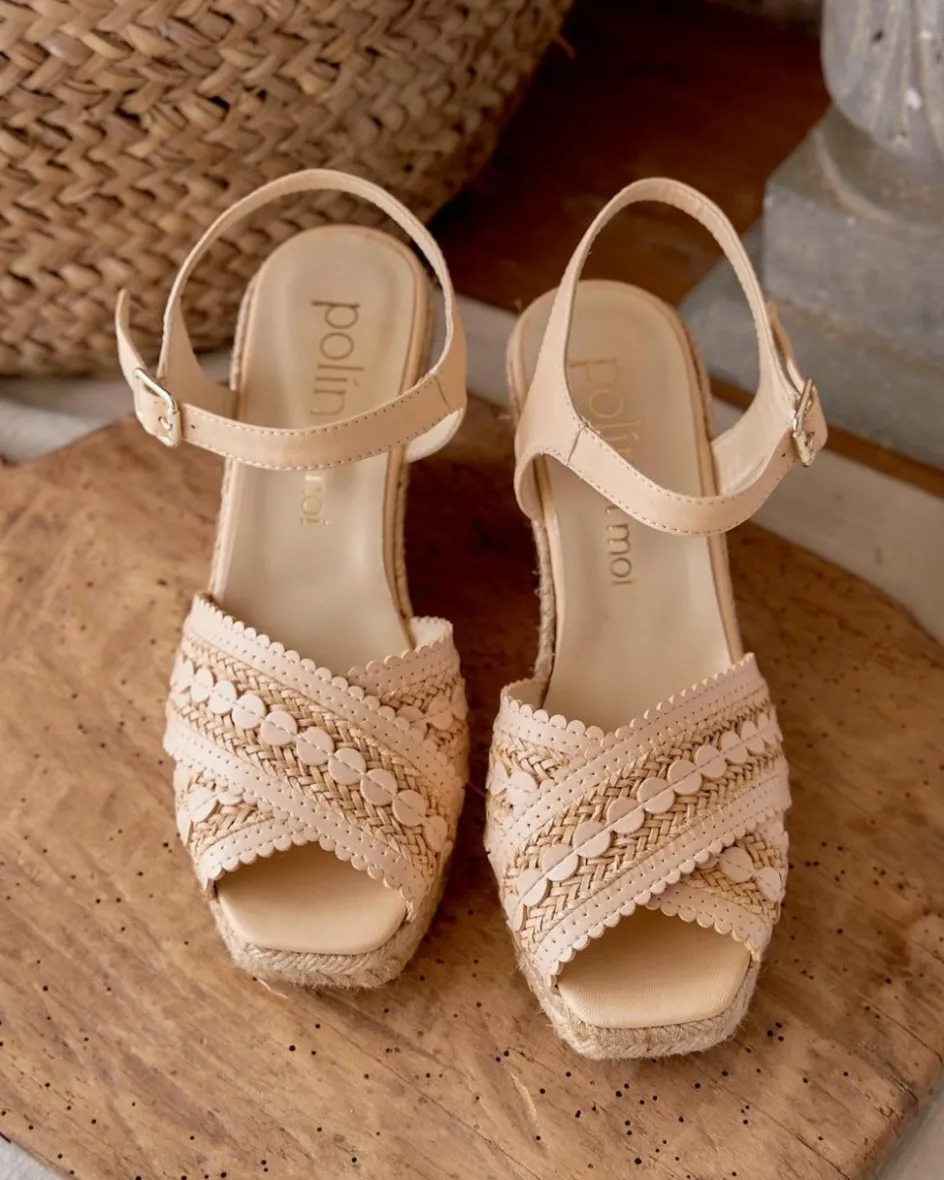Sandalia de piel con cuña en color crema. Punta ligeramente cuadrada. Escote con doble cinta de piel rectangular cruzada con detalles muy especiales. Sujeción al tobillo cinta en color camel. Talón con cinta para mayor sujeción. Interior de piel. Fabricación española de yute natural. Una sandalia alta muy cómoda tanto para el día a día como para la noche.
