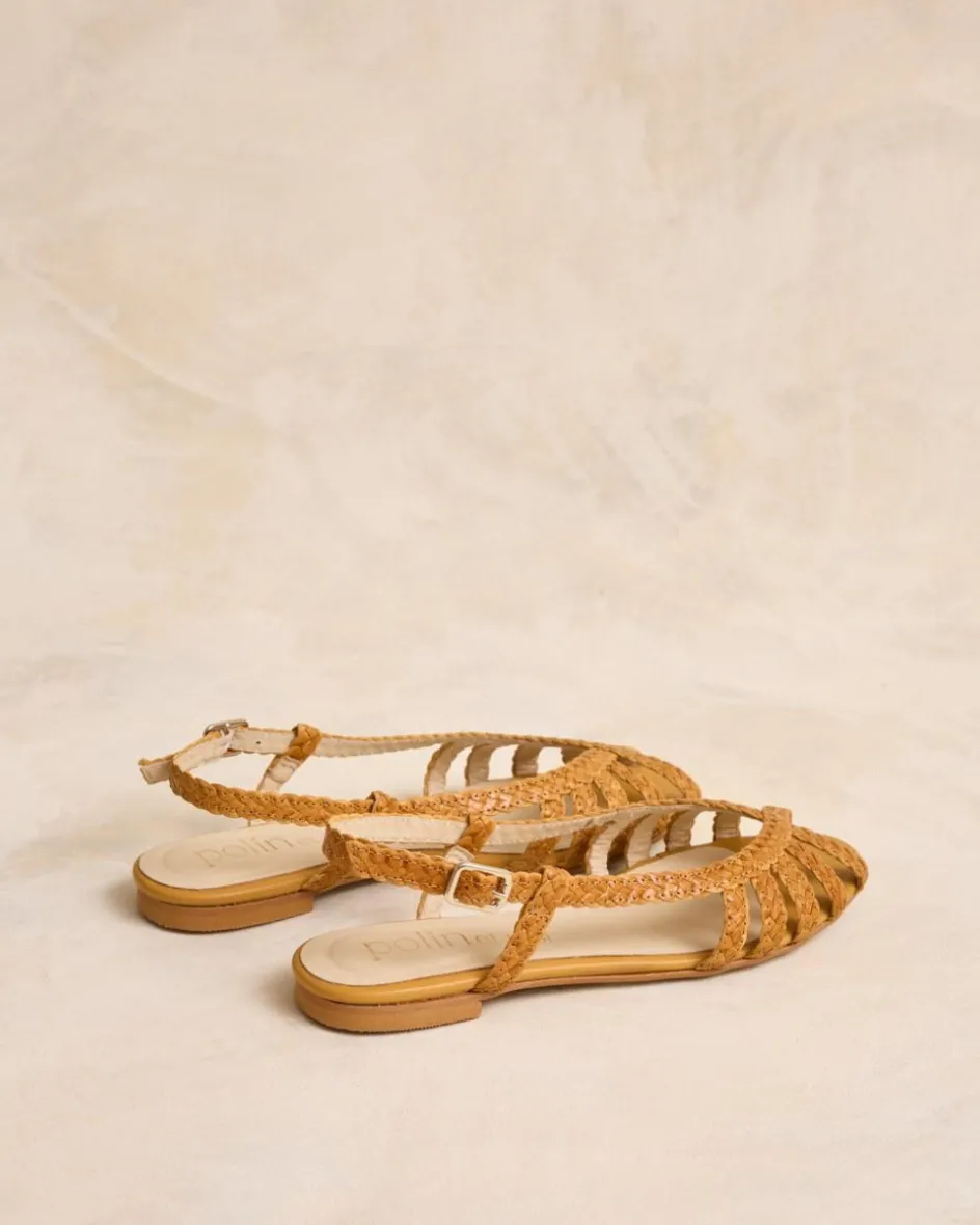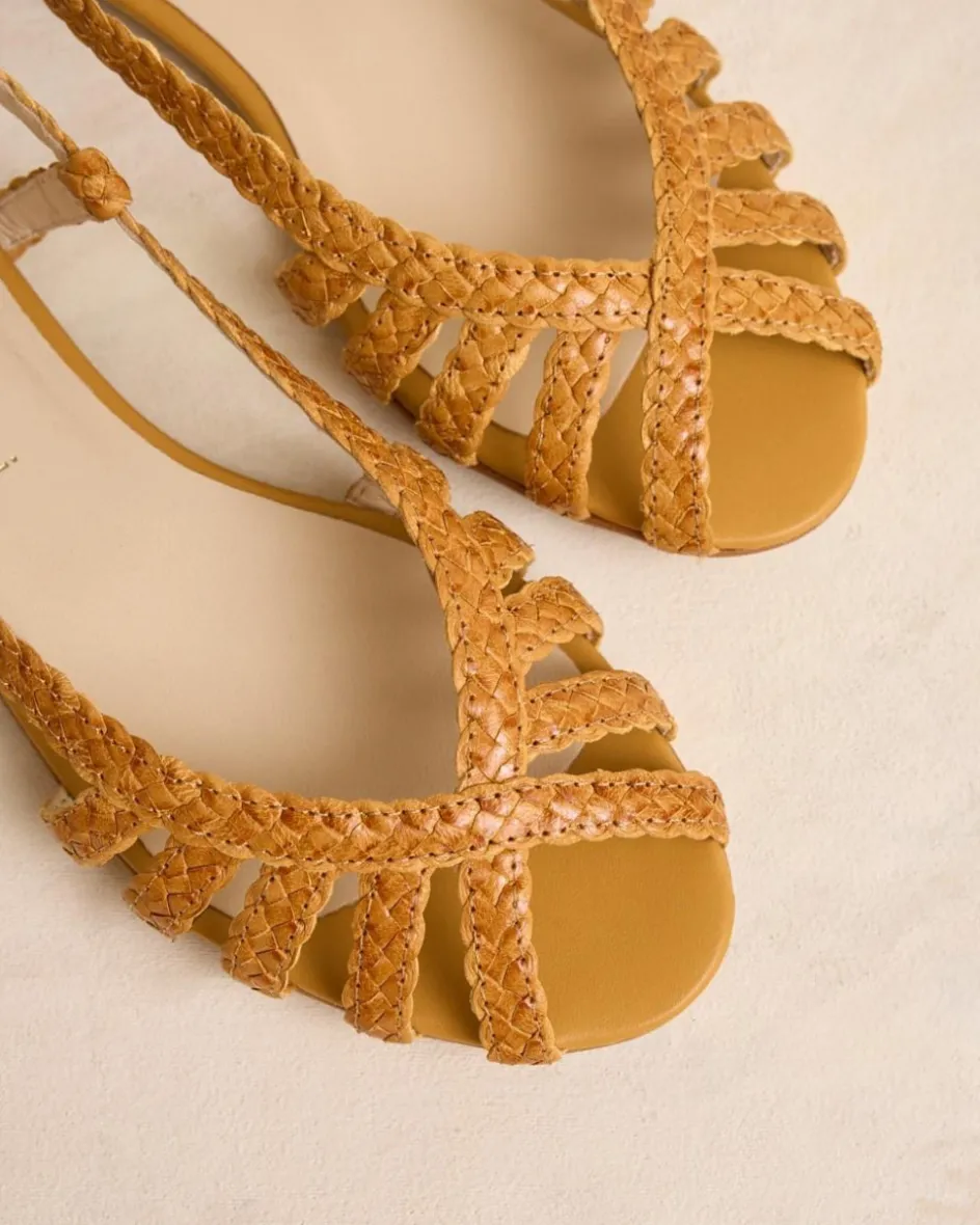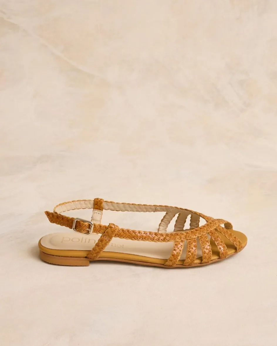 Sandalia plana en piel trenzada de color mostaza. Puntera abierta y puntiaguda. Aperturas sobre el empeine con tiras de piel trenzadas. Sujeción al tobillo con finas tiras con hebilla. La plantilla tiene una almohadilla para mayor comodidad. Una sandalia para elevar cualquier look esta temporada.