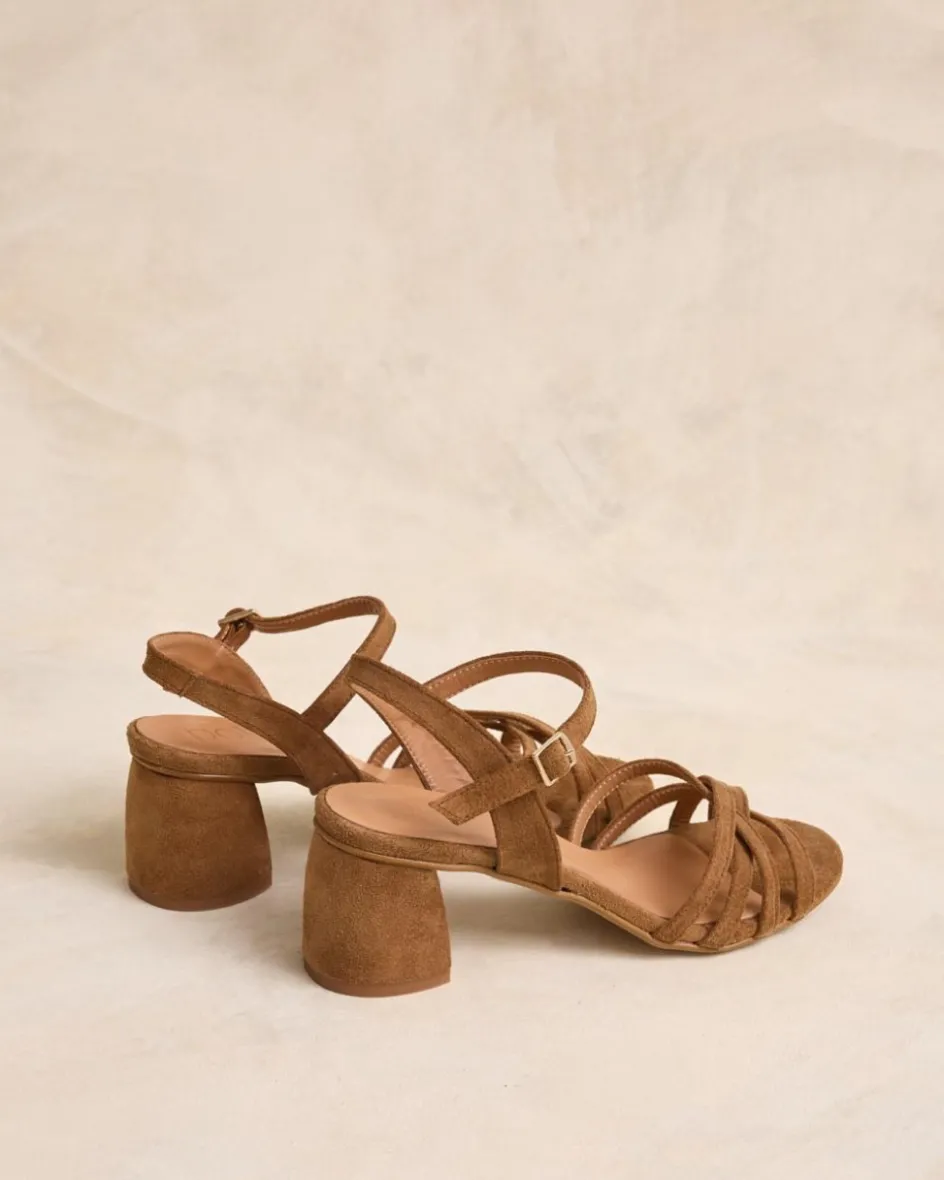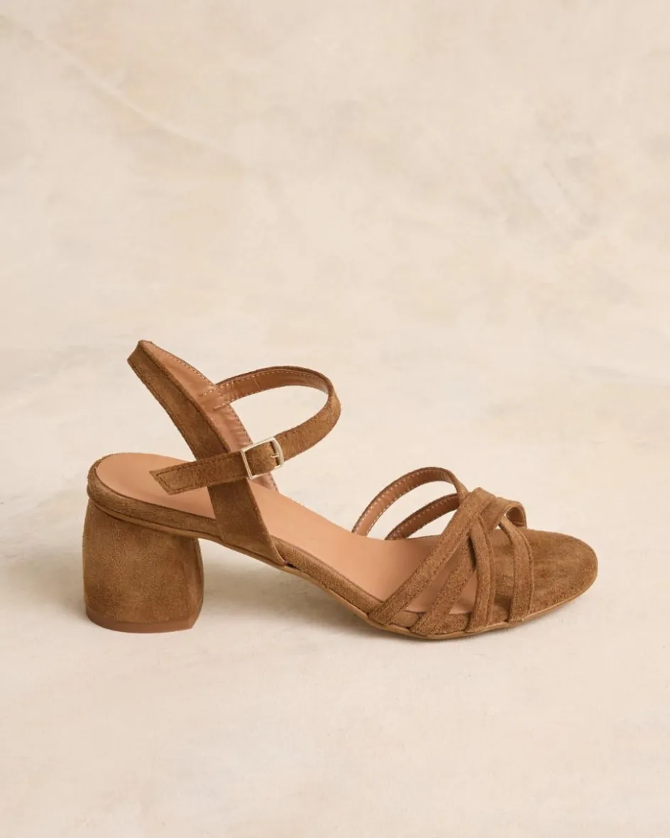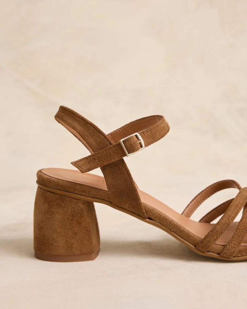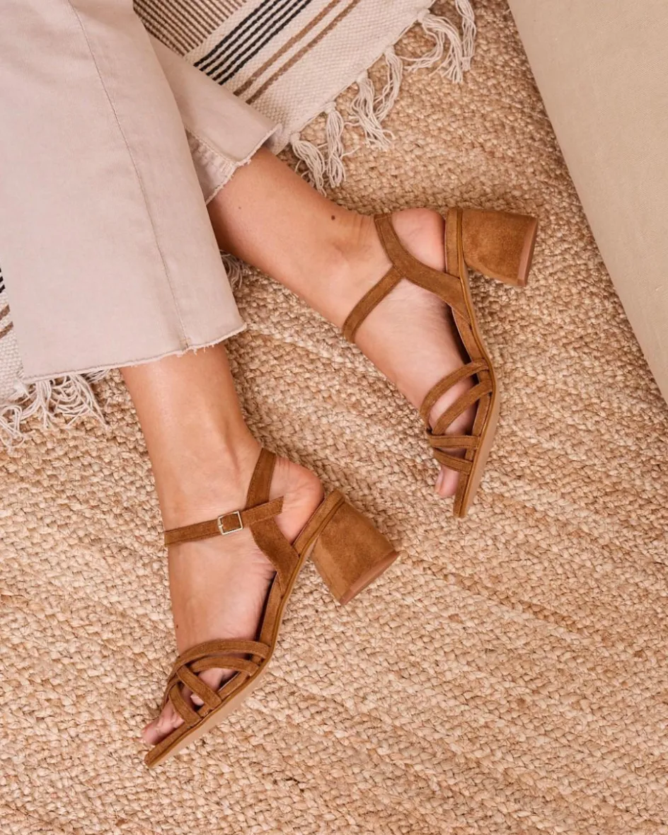 Sandalia de tacón en ante en color cuero. Puntera abierta y ligeramente puntiaguda. Tiras a tono sobre el empeine. Sujeción al tobillo con finas tiras con hebilla. Pequeño tacón cuadrado y cómodo. La plantilla tiene una almohadilla para mayor comodidad. Una sandalia para elevar cualquier look esta temporada.
