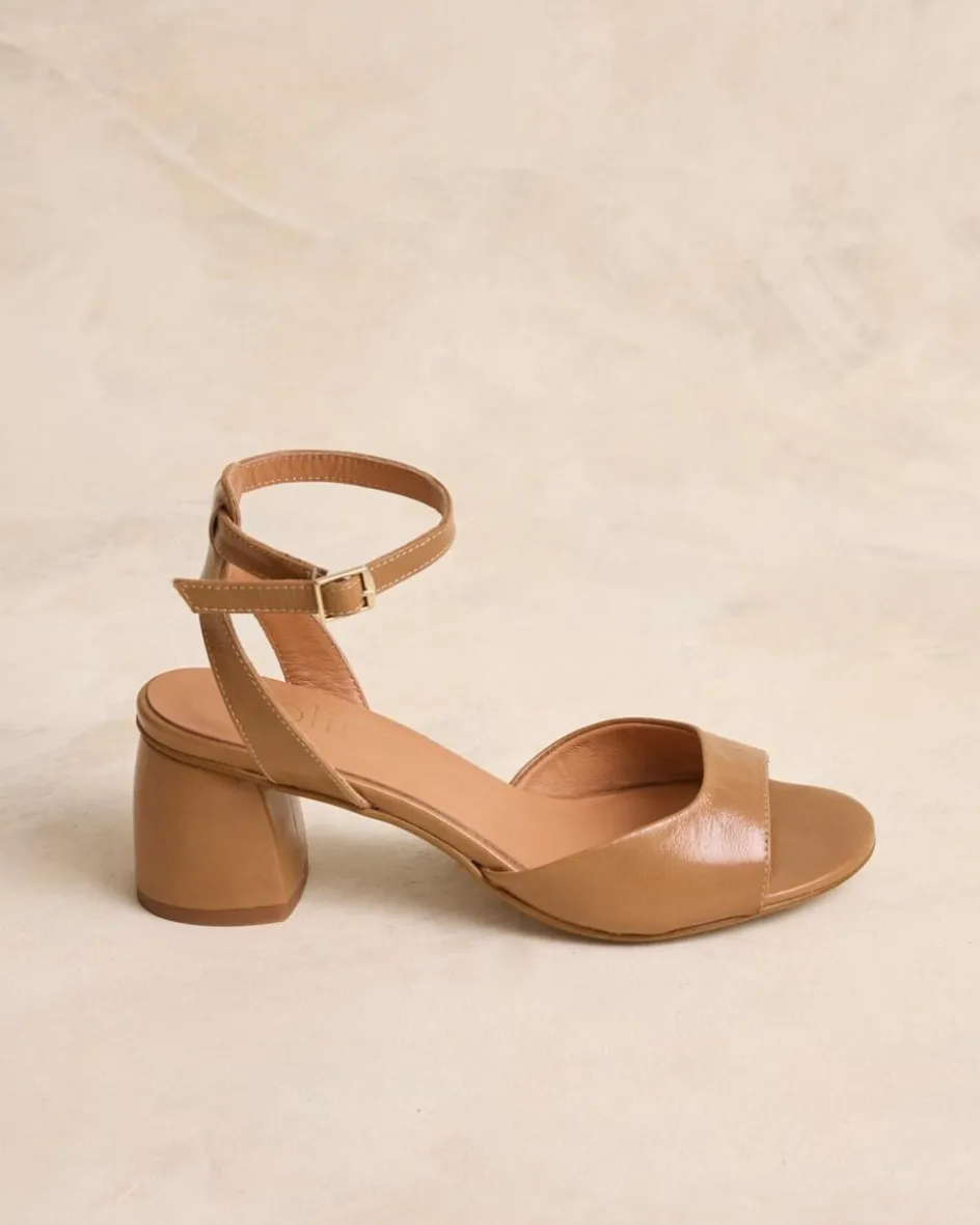 Sandalia de piel con tacón en tono cuero. Puntera abierta ligeramente redonda. Escote redondeado. Tacón cuadrado. Cierre al tobillo con tiras en tono y hebillas para ajustar la sandalia al tobillo. Una sandalia elegante y cómoda.
