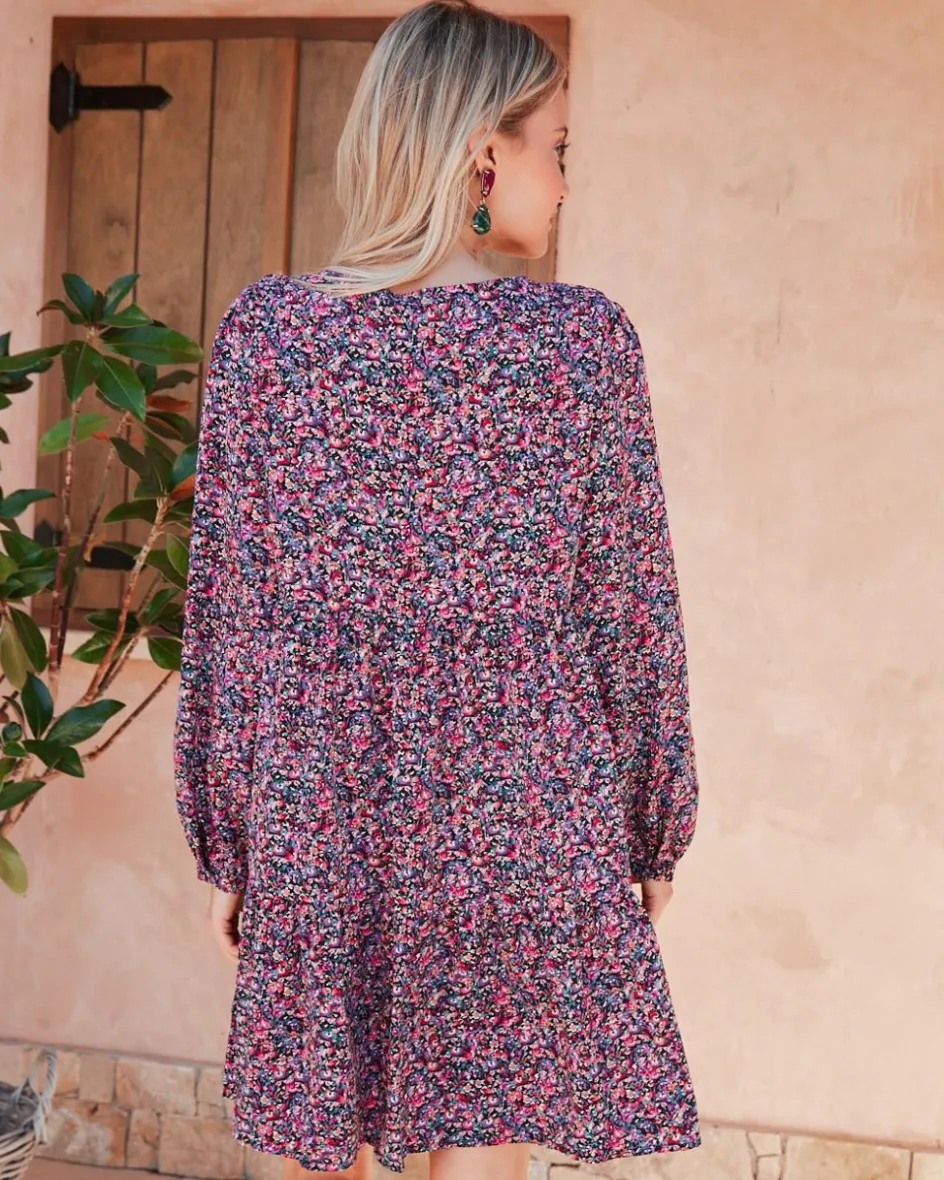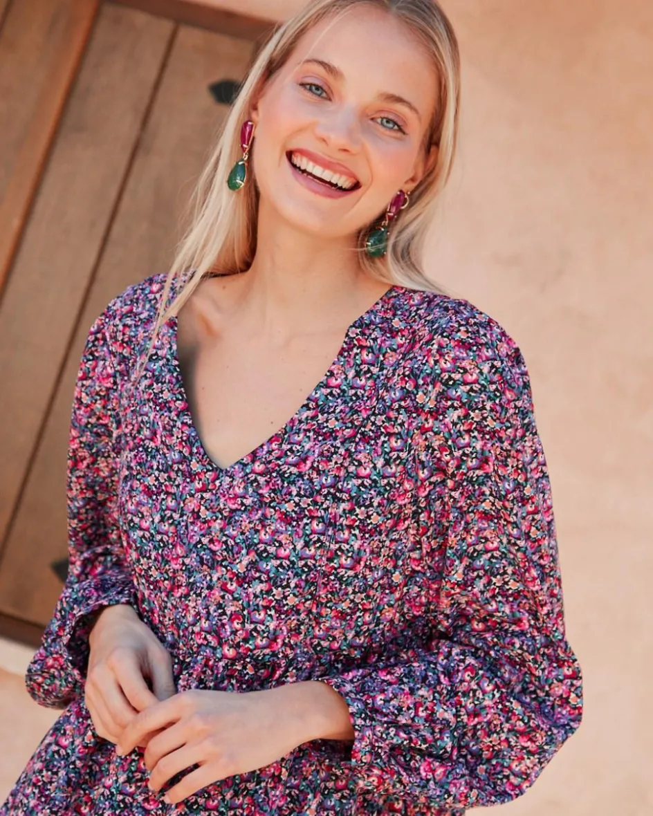 Vestido con corte babydoll corto con estampado floral en color morado. Cuello camisa. Modelo de manga larga terminado en puño. Dispone de forro interior. Falda corta y con volumen.