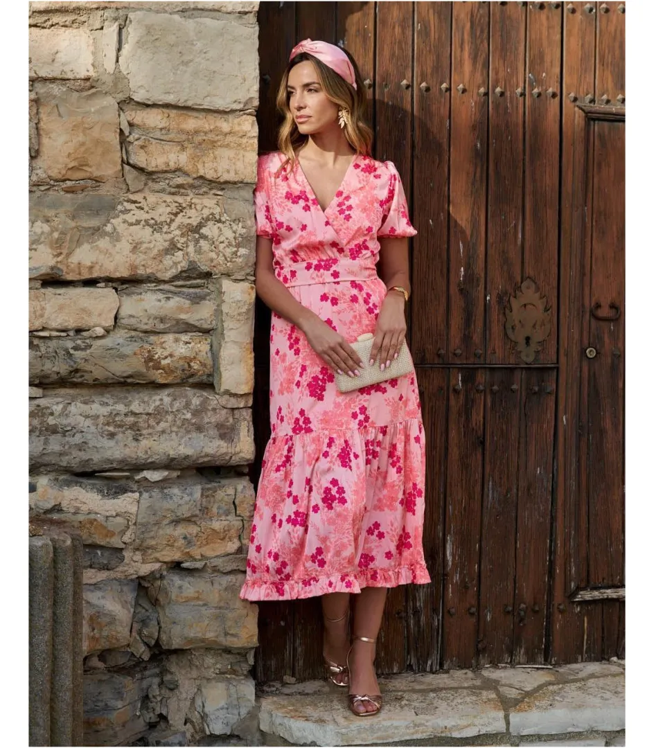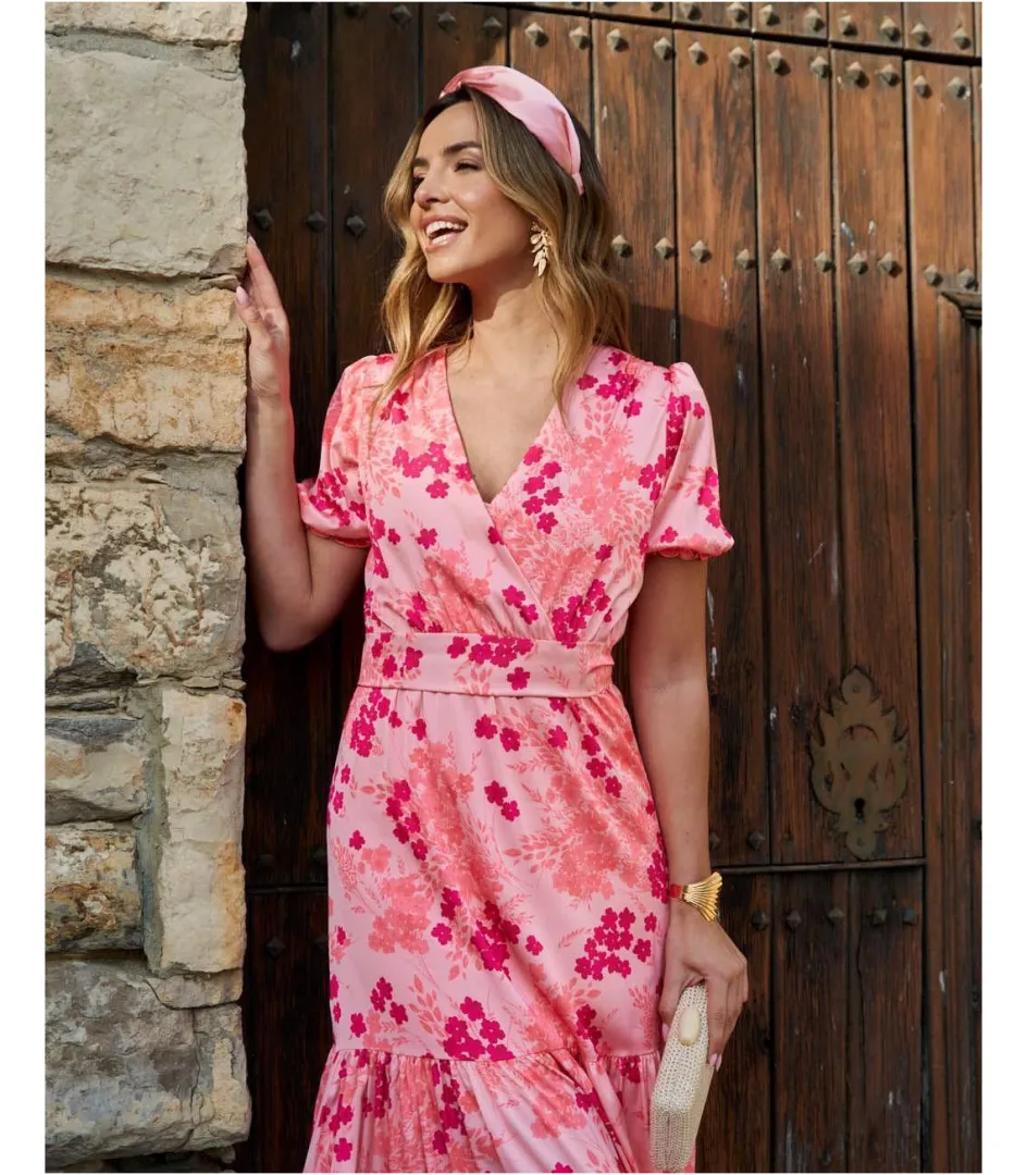 Vestido largo con estampado floral en color melocotón. Escote en pico cruzado. Corte en la cintura con detalle de cinta para atar a modo de cinturón en el mismo estampado del vestido. Manga corta abullonada con detalle de elástico y terminada en peuqeño volante. Falda con diseño recto con volante en el bajo con algo de vuelo. Incluye forro interior. Vestido estiloso y fabuloso para lucir en tus eventos favoritos. Vestido también ideal para el embarazo y lactancia.