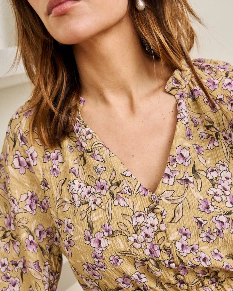 Vestido midi con estampado de flores en color verde oliva. Cuello redondo y escote en pico. Modelo de manga larga ligeramente abullonada. Vestido de cintura marcada mediante elástico. Falda midi, con ligero vuelo y bajo con un gran volante. Hilera de botones forrados desde el cuello hasta el bajo. El vestido más cómodo y romántico para los días de invierno.