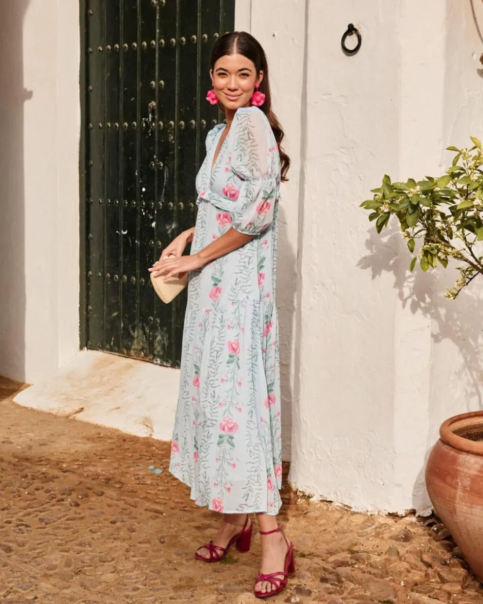 Vestido con estampado floral, sobre fondo celeste. Escote en pico, con volante debajo del pecho. Cintura ligeramente más ajustada con goma para una mayor adaptación al cuerpo. Manga 3/4 abullonada. Bajo del vestido fluido. Un vestido ideal para las invitadas con un toque de color muy especial. También perfecto para el embarazo.