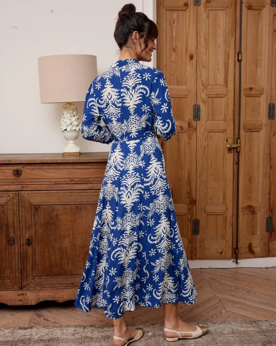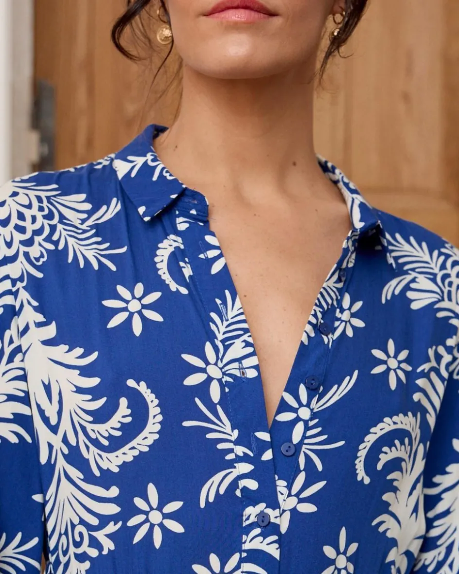 Vestido camisero largo con estampado floral sobre un fondo en color azul. Vestido con cuello de camisa. Cinturón a juego en la cintura. Manga 3/4. Hilera de botones desde el cuello hasta la altura del muslo. Falda larga, con abertura central. Vestido ideal para la lactancia.