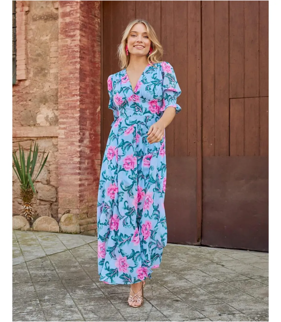 Vestido largo con estampado floral en azul celeste. Escote en pico. Corte bajo el pecho y a la cintura a modo de fajín con elástico a la espalda. Manga 3/4 ligeramente abullonada con detalle de ancho elástico al final. Falda con diseño recto y ligero vuelo. Incluye forro interior. Vestido estiloso y fabuloso para lucir en tus eventos favoritos. Vestido también ideal para el embarazo.