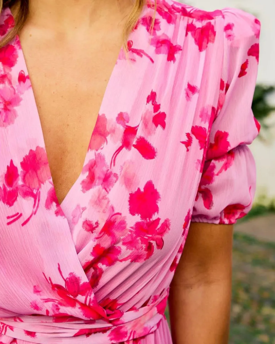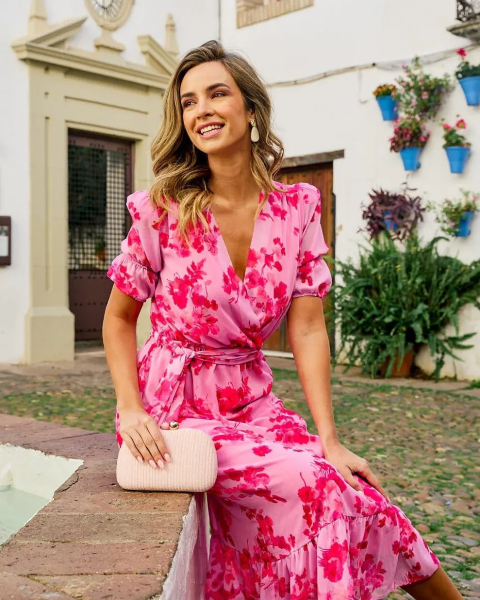 Vestido largo con estampado floral en color frambuesa. Escote en pico cruzado. Corte en la cintura con detalle de cinta para atar a modo de cinturón en el mismo estampado del vestido. Manga corta abullonada con detalle de elástico y terminada en volante. Falda con diseño recto con volante en el bajo con algo de vuelo. Incluye forro interior. Vestido estiloso y fabuloso para lucir en tus eventos favoritos. Vestido también ideal para el embarazo y lactancia.