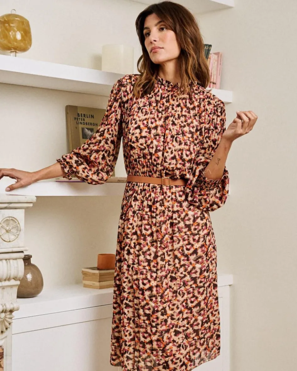 Vestido plisado de largura midi con estampado floral sobre un fondo en color beige. Cuello redondo con pequeño volante. Modelo de manga larga terminado en elástico. Dispone de forro interior. Falda midi con vuelo.