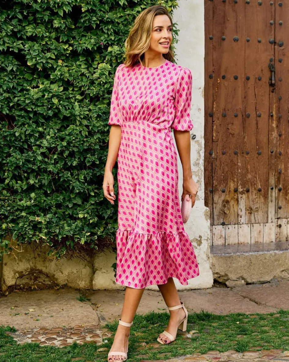 Vestido midi con estampado floral en color frambuesa. Escote en redondo y cerrado. Manga corta ligeramente abullonada. Cintura con corte ligeramente más estrecha. Bajo del vestido con volante para mayor vuelo y movimiento. Vestido muy favorecedor y estiloso para estar estupenda esta temporada.