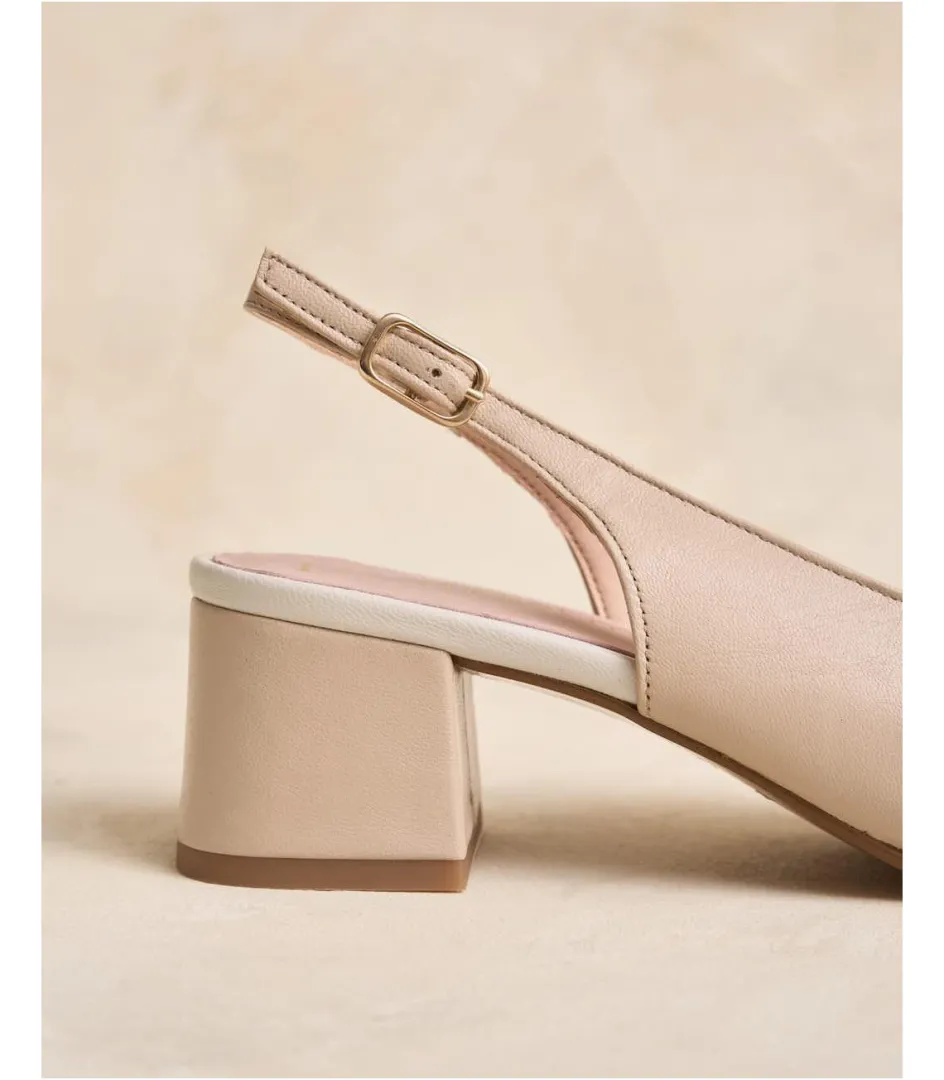 Zapato de piel destalonada en color piedra. Puntera ligeramente cuadrada en color crudo. Correa regulable con hebilla al talón. Tacón cuadrado. Es un calzado diferente y cómodo para combinarlo tanto con pantalones como con vestidos.