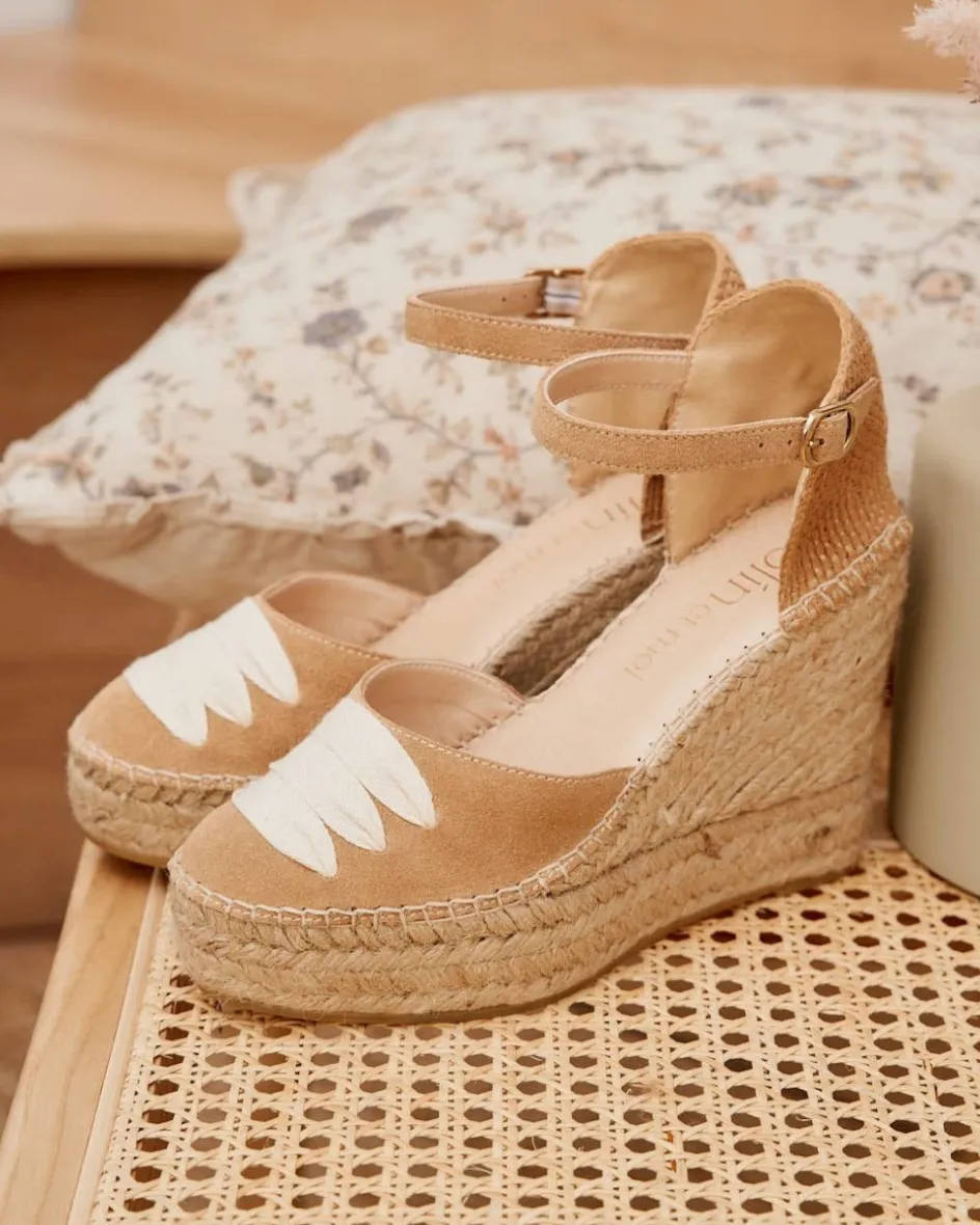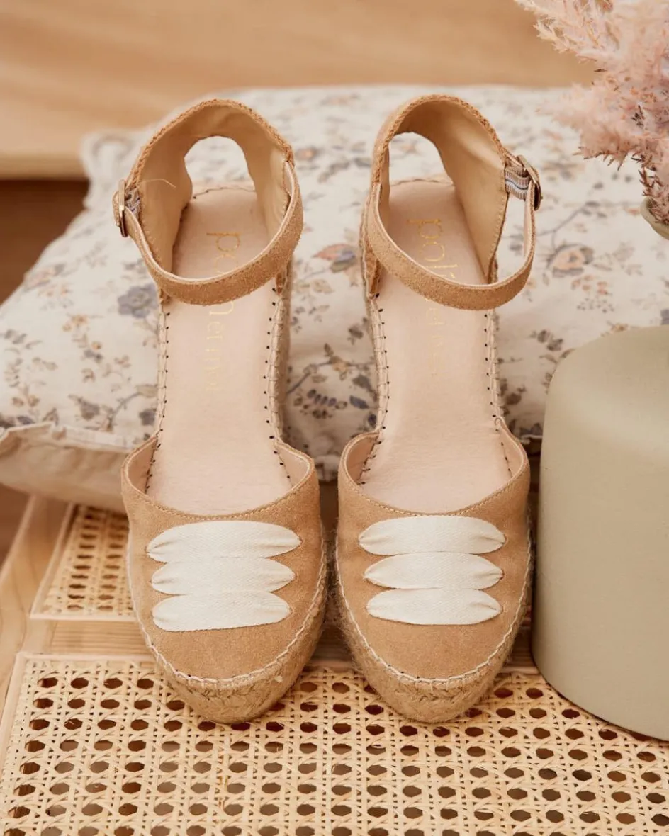 Alpargata con plataforma en serraje en color camel. Puntera ligeramente en redondeada con detalle de cintas cruzadas en color crudo. Sujeción al tobillo con pulsera con hebilla. Escote abierto ligeramente redondeado. Talonera cosida con hilo y esparto. Fabricación española de yute natural. La plantilla tiene una almohadilla para mayor comodidad. Una alpargata femenina y cómoda para esta temporada. Diseñado y fabricado en España.