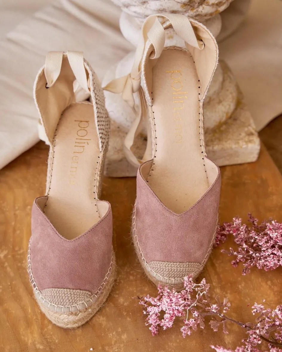 Alpargata de plataforma en ante de color malva. Sujeción al tobillo cintas en color crudo. Escote abierto en forma de corazón. Fabricación española de yute natural. La plantilla tiene una almohadilla para mayor comodidad. Una alpargata estilosa y femenina para el día a día. Diseñado y fabricado en España.