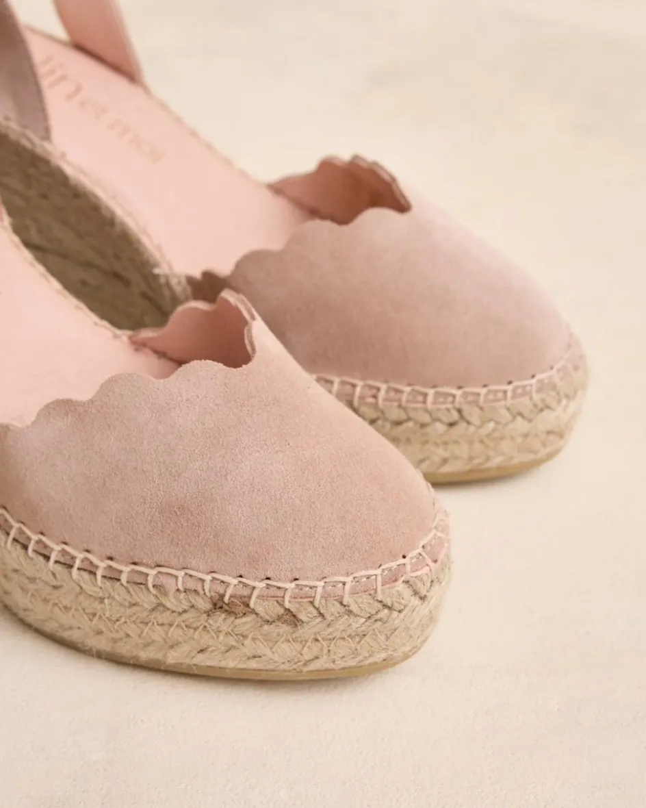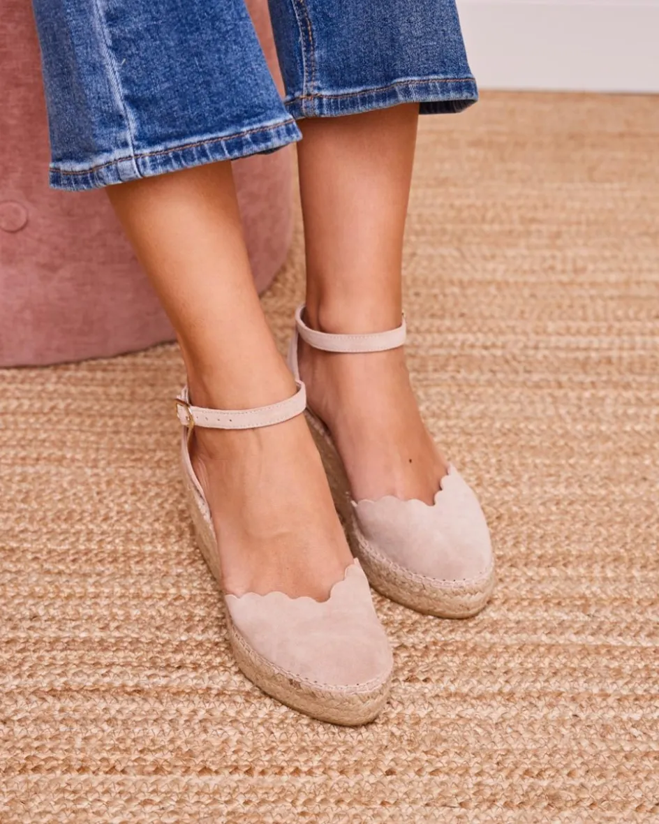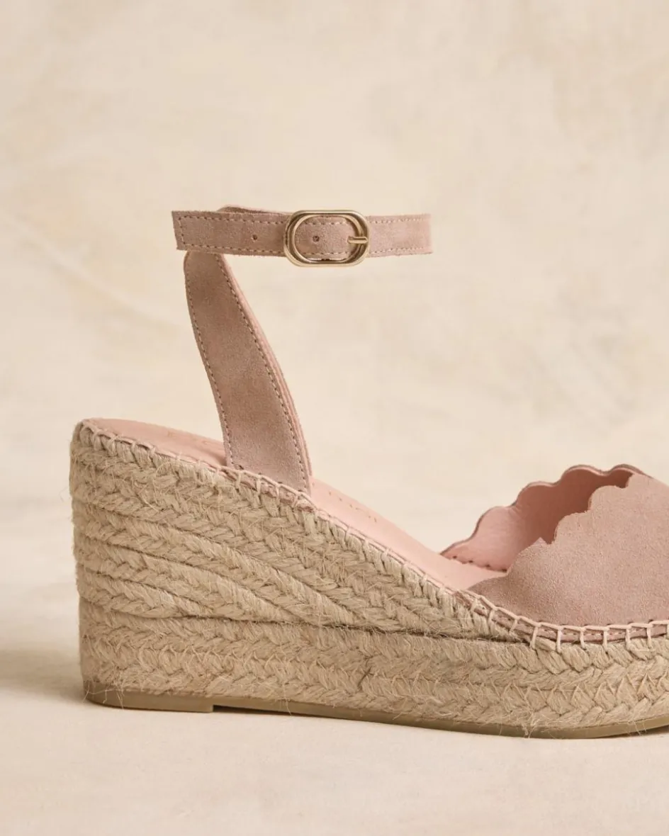 Alpargata de cuña en serraje en color nude. Puntera redondeada. Escote en corazón con pequeñas ondas. Cierre mediante correa con hebilla al tobillo. Fabricación española de yute natural. La plantilla tiene una almohadilla para mayor comodidad. Una alpargata original que puedes combinar con tus looks favoritos esta temporada.