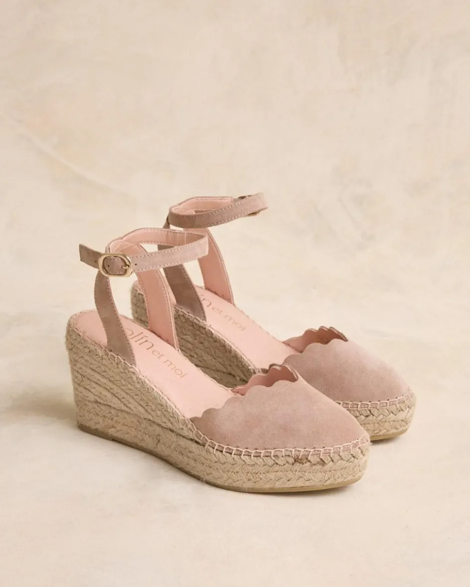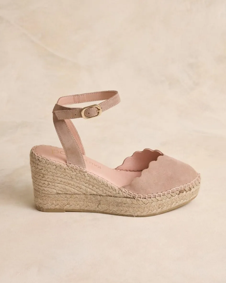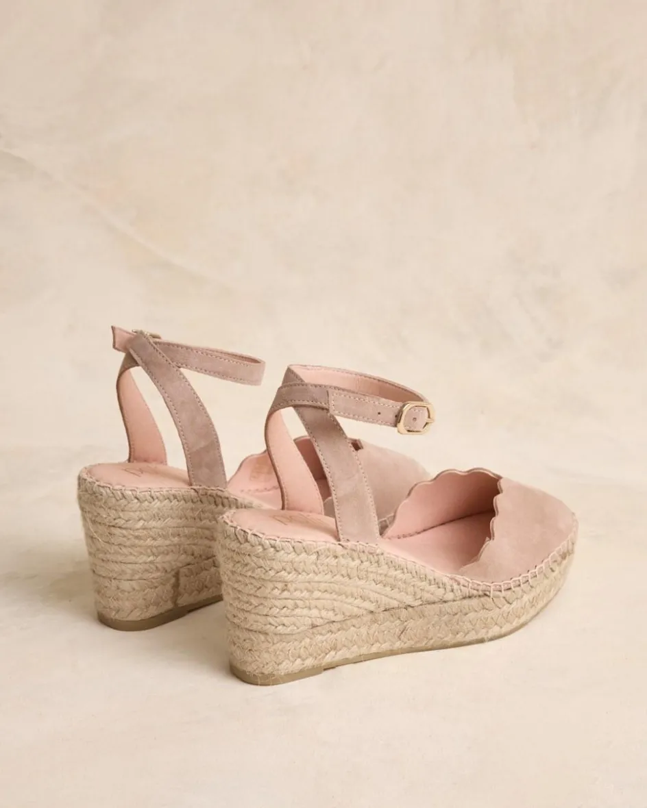 Alpargata de cuña en serraje en color nude. Puntera redondeada. Escote en corazón con pequeñas ondas. Cierre mediante correa con hebilla al tobillo. Fabricación española de yute natural. La plantilla tiene una almohadilla para mayor comodidad. Una alpargata original que puedes combinar con tus looks favoritos esta temporada.
