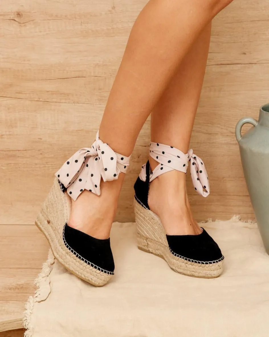 Alpargata con plataforma en serraje en color negro. Puntera ligeramente en redondeada. Sujeción al tobillo con cinta doble: cinta negra o cinta con tubular blanca con lunares negros. Escote abierto ligeramente redondeado. Talonera cosida con hilo y esparto. Fabricación española de yute natural. La plantilla tiene una almohadilla para mayor comodidad. Una alpargata femenina y cómoda para esta temporada. Diseñado y fabricado en España.Incluye ambas cintas