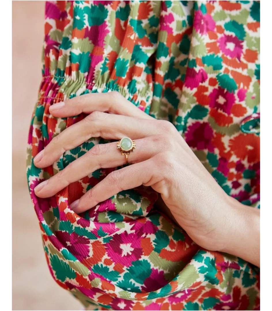Anillo en dorado ajustable con piedra en color verde ovalada.