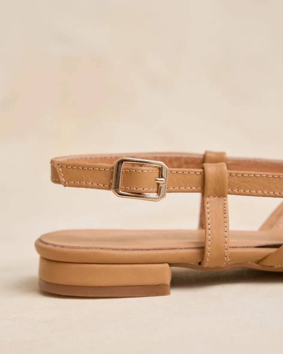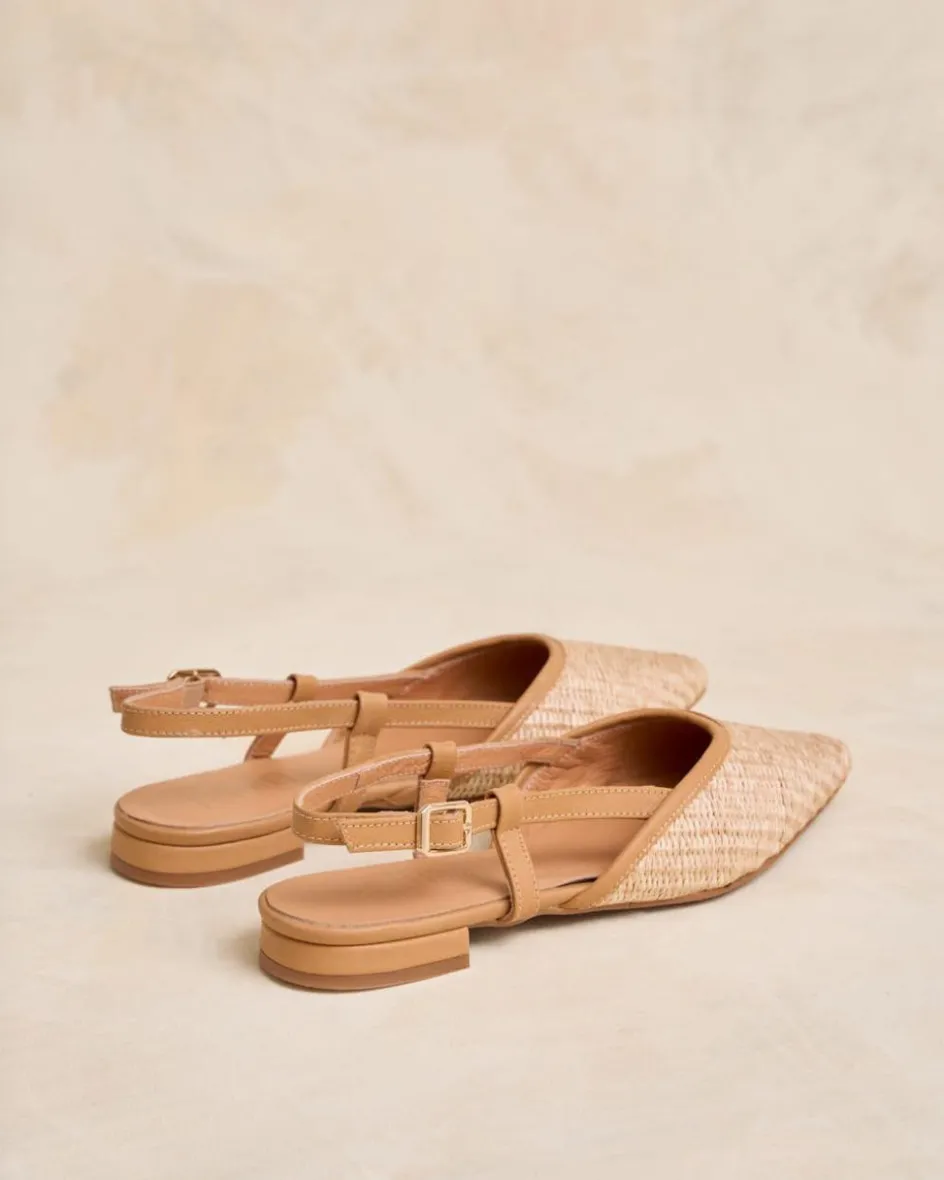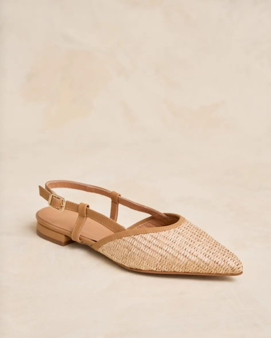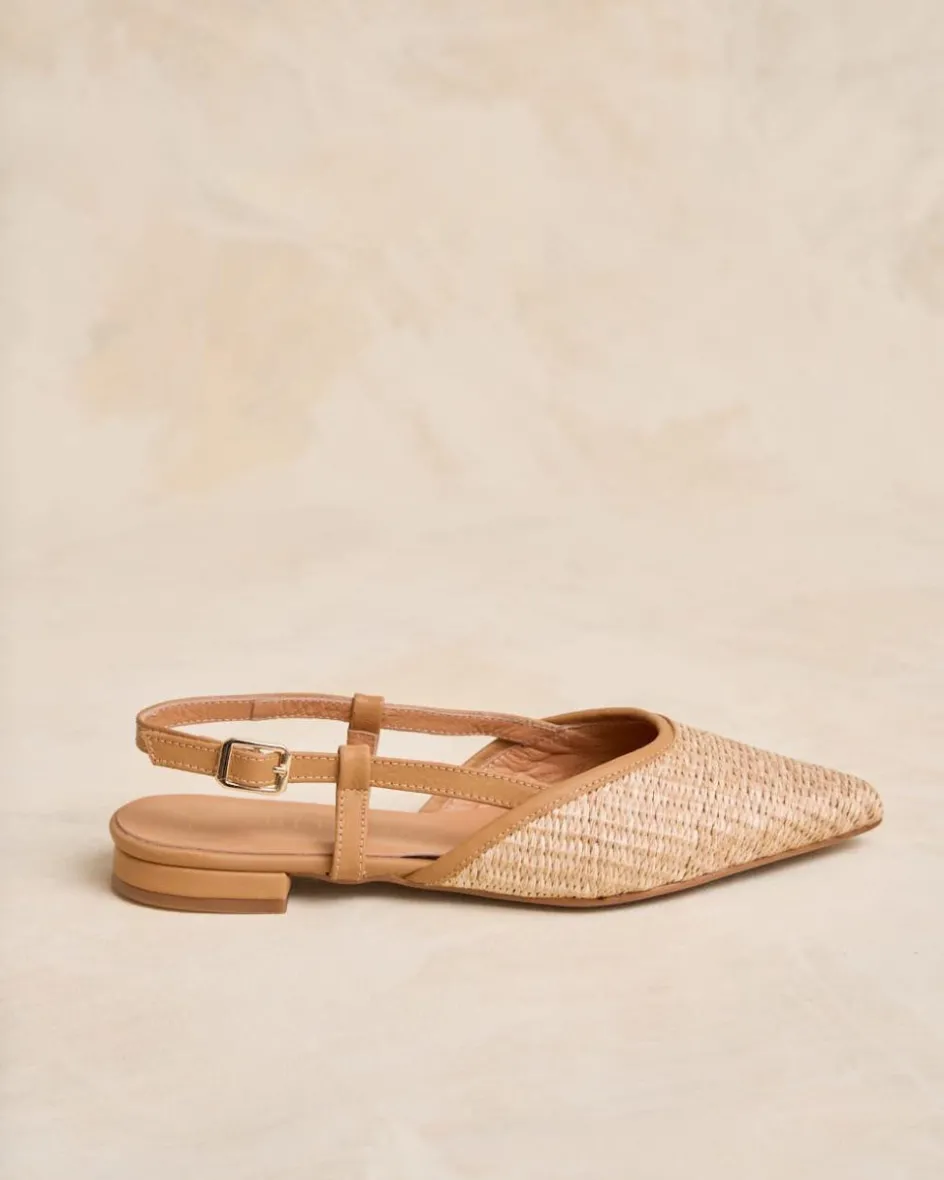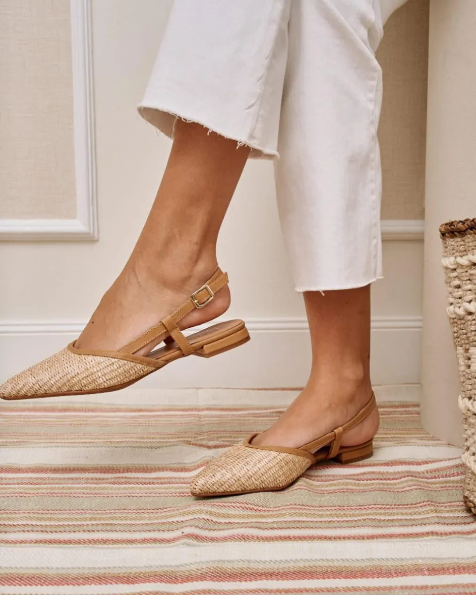 Bailarina con detalle de rafia, destalonada en color camel. Puntera puntiaguda. Escote redondeado. Correa con hebilla al talón. Es un calzado diferente y cómodo para combinarlo tanto con pantalones como con vestidos.