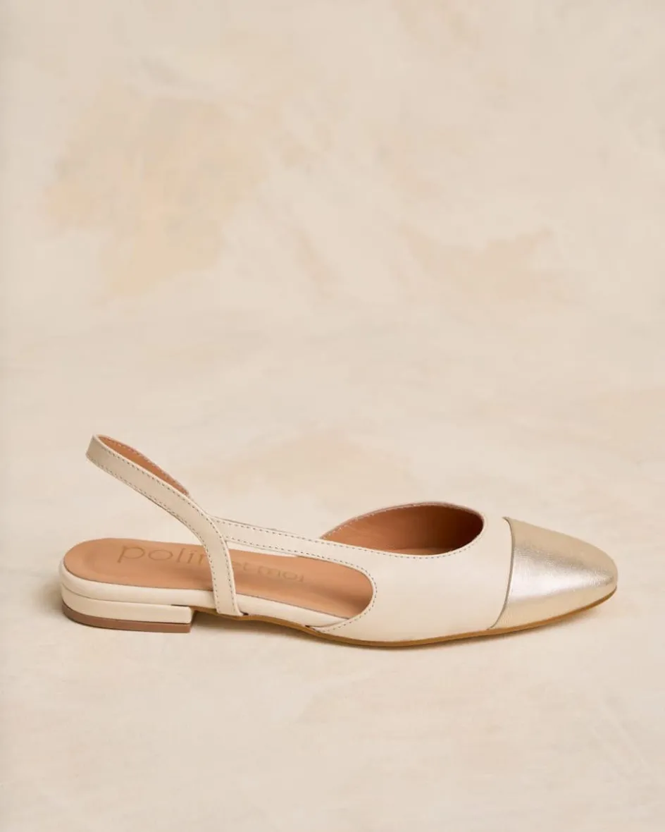 Bailarina de piel destalonada bicolor en tonos crudo. Puntera ligeramente puntiaguda en piel dorada. Correa al talón. Es un calzado diferente y cómodo para combinarlo tanto con pantalones como con vestidos.