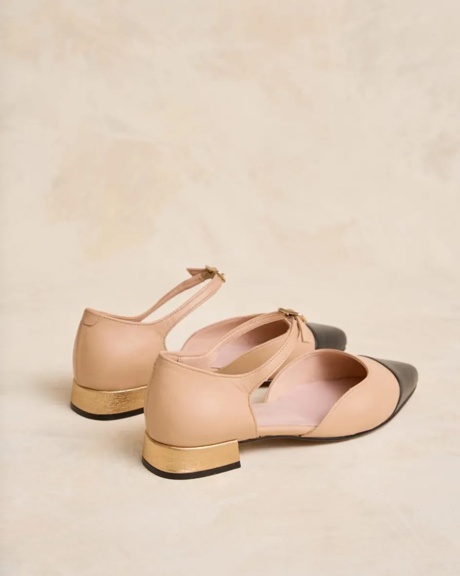 Bailarina de piel en color nude. Puntera puntiaguda en color negro. Correa con hebilla al tobillo. Pequeño detalle de tacón cuadrado en piel tono dorado. Es un calzado diferente y cómodo para combinarlo tanto con pantalones como con vestidos.