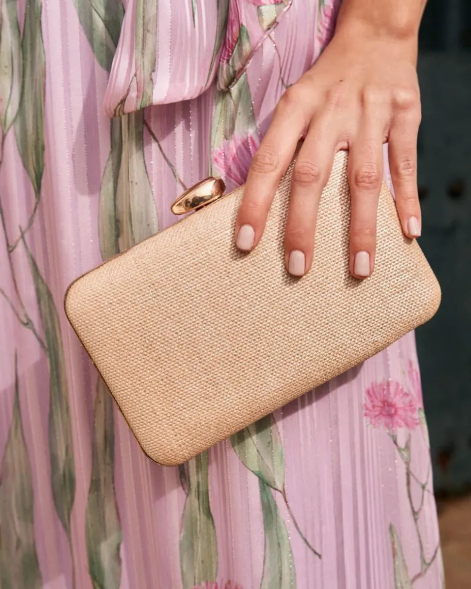 Clutch o bolso de mano en tono camel. Bolso con forma rectangular y puntas redondeadas con broche central metálico dorado que permite cerrar y abrir el bolso con facilidad.