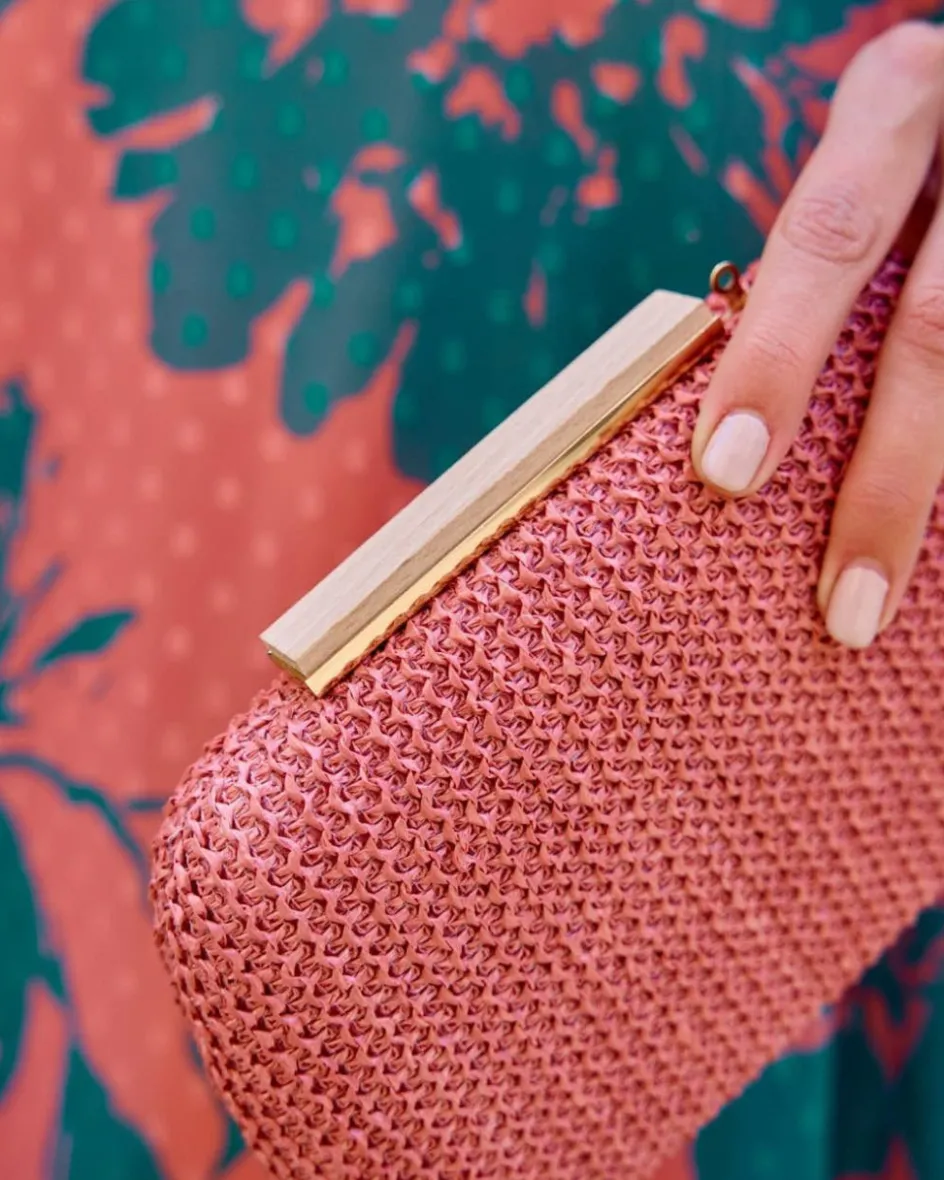 Clutch o bolso de mano en color frambuesa, con efecto de madera. Bolso con forma semi rectangular, más estrecho en la zona del cierre y puntas redondeadas con broche central de madera que permite cerrar y abrir el bolso con facilidad. Cuenta con una cadena interior para llevarlo colgado si se desea.