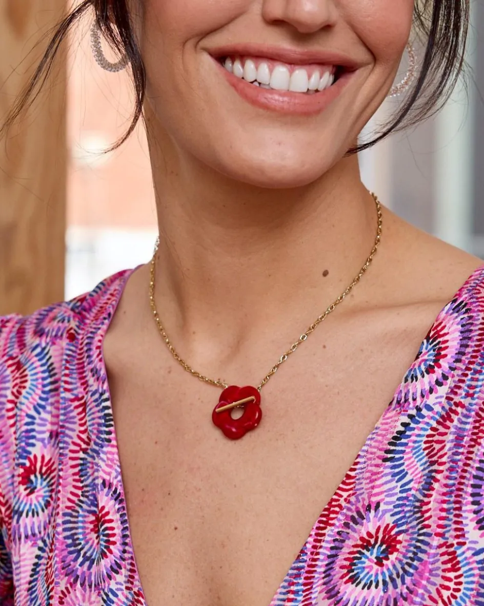 Colgante en tono dorado con detalle de una flor de tamaño mediano en color coral. Flor con volumen y un agujero central, ya que este detalle sirve, a su vez, de cierre. Colgante muy ligero y animado. Un colgante ideal para darle un toque de alegre y diferente a tus looks del día a día.