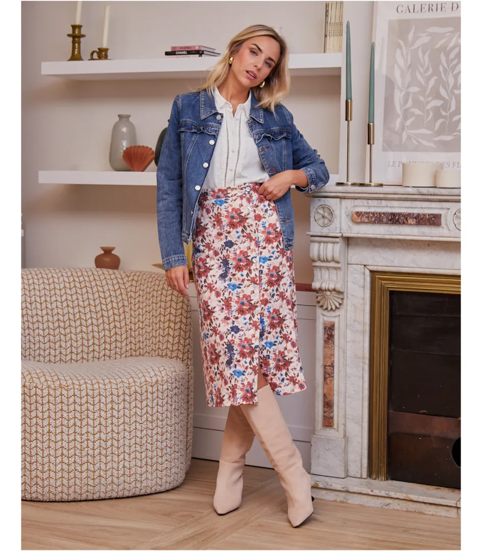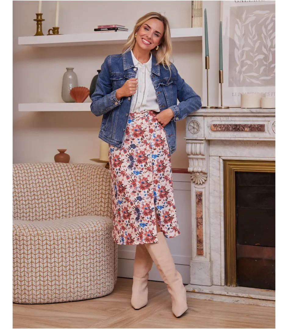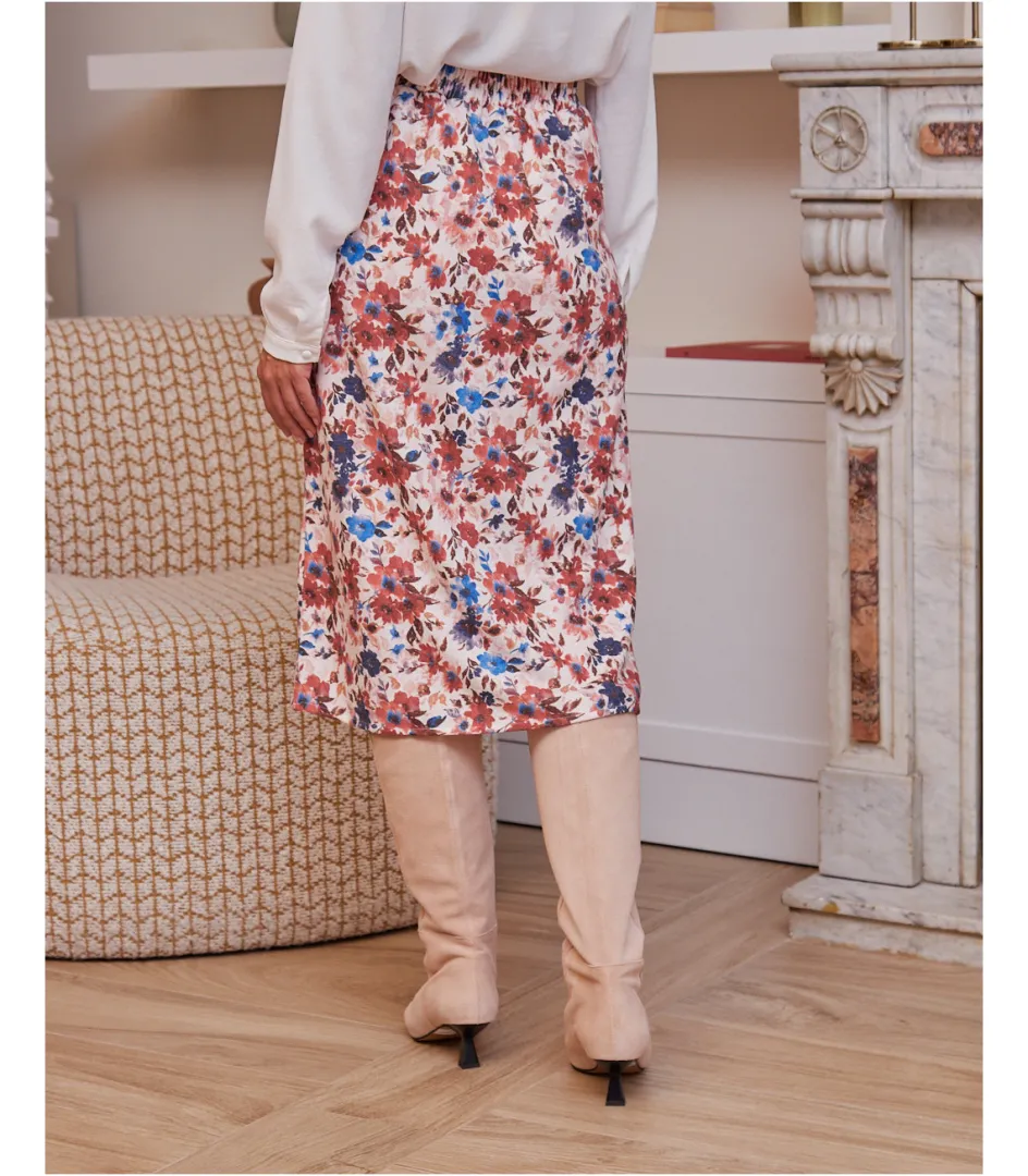 Falda midi con estampado floral en tonos azules y rosas. Falda recta de largura midi, de tiro y elástico a la cintura. Abertura central con hilera de botones. Una falda colorida e ideal para combinar con su top a juego.